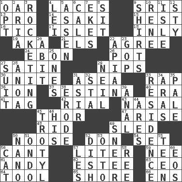 ACROSS 1. Boat paddle 4. Shoestrings 9. Indian titles of respect 13. Adept person 14. 1973 Nobel Price Winner (Physics) Leo 15. Behest 16. Nervous spasm 17. Small island 18. Inwardly 19. Alias (abbr.) 21. Raised railways 22. Match 24. Inky black, to poets 26. Plant holder 27. Smooth fabric 29. Cuts off 30. Join together 31. At sea 33. Reproach for some lapse or misdeed 36. Electrically charged atom 37. French poetic form 40. Period 41. Label 42. Monetary unit of Yemen 43. Rhinal 45. Son of Odin 47. Ascend 48. To free from 49. Downhill vehicle 50. Trap for birds or small mammals 52. Spanish title 54. Arrange properly for use 56. Patter 57. 61 cubic inches 59. Born 61. "60 Minutes" Commentator Rooney 62. First name in cosmetics 63. Corporate head (abbr.) 64. Instrument 65. Dinah or Pauly 66. Followers of ems DOWN 1. Choose 2. Operatic vocal solo 3. Shooting up abruptly 4. Flowery wreath 5. NE Netherlands city 6. Give a ring to 7. Makes supply last 8. Be seated 9. Upper-body garments 10. French philosopher Descartes 11. Capri or Wight 12. Filthy place 20. "This won't hurt ____!" 22. Bee-related 23. Grand Old Party 25. Singles 27. Set of matching outer garments 28. Small Philippine buffalo 29. Famous astronaut Armstrong 31. SW Saudi Arabia district 32. R.R. building 33. Home 34. Caspian sea tributary 35. Diluted with white 38. Eat (away) 39. Of or related to the anus 44. Ancient Greek god of war 45. Trinitrotoluene 46. Part of HMS, perhaps 49. Scornful expression 50. Billionth: prefix 51. Southwest Nigerian state 52. Food container 53. "Beetle Bailey" pooch 55. Adolescent 56. Feline 57. French article 58. To separate or throw off 60. Greek goddess of the dawn