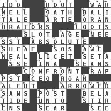 ACROSS 1. Wedding promise 4. Carrot, for example 8. Armed conflict 11. 1994 drama film starring Jodie Foster 13. Pledge 14. Indonesian resort city 15. Lie 16. Johnson of "Laugh-In" 17. NW Algerian seaport 18. Speakers 21. Plunders 22. Slit 23. Ripen 25. Born 26. Fast jet (abbr.) 29. Utter; complete 32. Bundle of cut stalks of grain 34. Distress signal 35. Deep reverence 38. Welt 39. It is permitted: Lat. 41. Stalk of a moss capsule 43. Compass dir. 44. _ tizzy (2 wds.) 45. Actors Connery and Penn 46. Meet 50. Strike 51. Pacific Standard Time (abbr.) 54. Corporate head (abbr.) 55. Wander 57. Eskimo relative 59. Moved like an arrow 63. Without 64. Mail 67. Actor Lugosi 68. Periodic rise and fall of the sea level 69. To (old English) 70. Use a swizzle stick 71. Followers of ems 72. Scorch 73. Perceive with the eye DOWN 1. To the inside or interior of 2. Letter starter 3. Water jar 4. Exposes to great heat 5. Rowing implement 6. Baseball player Mel 7. Definite Article 8. Make _____ (do battle with) 9. Having winglike extensions 10. Remove soap 12. Allows 14. Sometimes accompanies a hiss 19. Norwegian king 20. Director Reiner 21. Allow 23. _ vera 24. Abrupt rush of wind 26. Compass dir. 27. "______ My Girl" (Turtles hit) 28. Beverages made from leaves 30. Motion picture award 31. Comfort 33. Actor Baldwin 36. Put on (as clothing) 37. Inactive volcano in Sicily 39. Actor's bit 40. A message received and understood 42. Cleo's killer 45. Play the lead 47. Sep. follower 48. Speaker 49. Or not 51. Thick mixture 52. Killed 53. Looks after 56. Disorderly crowds 58. Purpose 60. Soaks 61. Writer Wiesel 62. Have the gumption 64. Festering 65. Single 66. R.R. building