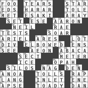 ACROSS 1. Egg _ yung 4. Pulls into pieces 9. Play the lead 13. Begley and Asner 14. Ethiopian city, capital of Harari 15. Lacquered or enameled metalware 16. Was introduced to 17. 1973 Nobel Price Winner (Physics) Leo 18. Like ___ of sunshine 19. Arrange properly for use 21. Compass dir. 22. Composer Copland 24. Famous astronaut Armstrong 26. Actress Charlotte 27. Trials 29. Fly high 30. Satellite of Uranus 31. Ancient Greek god of war 33. Car dealer's back yard 36. HTML Container Element 37. Shoved, as through a crowd 40. Followers of ems 41. Perceive with the eye 42. A really long time 43. Phillipine bananalike plant 45. Religious group 47. Distance measurement 48. Frozen water 49. Brightly colored fish 50. Grain storage towers 52. Tired old horse 54. Lair 56. Small Philippine buffalo 57. For Whom the Bell _____ 59. Hit sharply and swiftly 61. Austrian-born American filmmaker Fritz 62. An arm off of a larger body of water 63. Compass dir. 64. Domed church section 65. Sycophant 66. One of the 12 tribes of Israel DOWN 1. Opposite of masc. 2. Lyric poems 3. Clearly or manifestly demonstrative 4. Definite Article 5. Artist's stand 6. Caspian sea tributary 7. Libertine 8. _ Lanka 9. A viewer who gazes fixedly 10. "Corrida" creature 11. ____ Jay Lerner 12. Marina Del _, California 20. Wig 22. Came up 23. American Automobile Association (abbr.) 25. Small island 27. Small amounts or degrees 28. 4th largest of the Great Lakes 29. Stitched 31. Collude with 32. Friend of Pooh 33. Tough but pliablecoriaceous 34. At one time in the past 35. Russian ruler of old 38. Shoestrings 39. Moist 44. Necklace unit 45. Fodder prepared in a silo 46. Environmental prefix 49. Stared 50. Fastener 51. Charged atoms 52. Words to Nanette 53. Silent film actress Nazimova 55. Nanny 56. Insect wing 57. Teat (slang) 58. Filthy place 60. Fenced enclosure