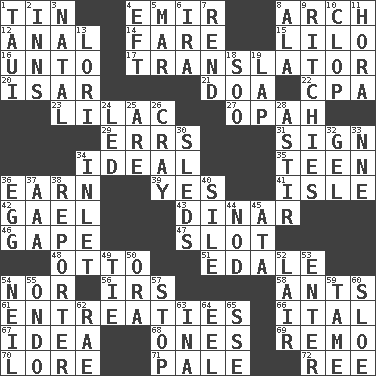 ACROSS 1. Metal container 4. Independent ruler or chieftain 8. Bowlike part 12. Of or related to the anus 14. Conductor's collection 15. _ and Stitch 16. To (old English) 17. Interpreter 20. Austrian river, tributary to the Danube 21. ___ good deed 22. Numbers guy (abbr.) 23. Pale purple color 27. Brightly colored fish 29. Blunders 31. Public display of a written message 34. Standard of perfection 35. Adolescent 36. Merit 39. Affirmative reply 41. Capri or Wight 42. Highlander 43. Middle Eastern gold or silver currency 46. Stare wonderingly 47. Narrow opening 48. Von Bismarck 51. Peak District village in England 54. Or not 56. Big collection agency 58. Pismires 61. Pleas 66. Slanted text style (abbr.) 67. The content of cognition 68. Washington bills 69. San ____ (Riviera town) 70. Old wives' tales, e.g. 71. Light colored 72. To separate or throw off DOWN 1. "Change" in Tahitian 2. Taverns 3. Brizilian seaport 4. Lizard (obsolete) 5. Spoil 6. Retirement account (abbr.) 7. Tear apart 8. According to 9. Actors Guy, Robert Welles, and Clint 10. Hoof sound 11. Israeli folk dance 13. Australian parrot (variant) 18. "Barney Miller" actor Jack 19. Infant locale 24. Directed 25. "We ___ not amused" (Victoria) 26. Supercomputer manufacturer 28. Having gotten out of bed 30. Bobsleighs 32. Set 33. Compass dir. 34. An arm off of a larger body of water 36. Ovum 37. Auto club (abbr.) 38. News announcer 40. Drop; flow; fall 44. Lower and raise head in agreement 45. "One Day ___ Time" 49. Make a knot 50. Mouth or opening 52. Den 53. Keyboard key 54. Famous astronaut Armstrong 55. Southwest Nigerian state 57. Close up, plug up 59. Not wild 60. _ gin 62. Actress Charlotte 63. _ tizzy (2 wds.) 64. Snakelike fish 65. Compass dir.