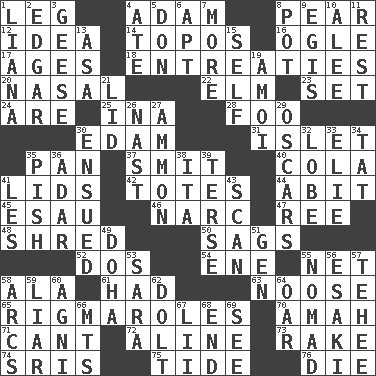 ACROSS 1. Part of a journey 4. First of billions? 8. Lightbulb-shaped fruit 12. The content of cognition 14. Traditional theme or motif 16. Stare at amorously 17. Ripens 18. Pleas 20. Relating to the nose 22. Shade tree 23. Put into a specified state 24. "We ___ not amused" (Victoria) 25. _ tizzy (2 wds.) 28. Egg _ yung 30. Dutch treat 31. Small island 35. Baking dish 37. Stricken, poetically 40. Root beer relative 41. Flaplike coverings 42. Hauls 44. "This won't hurt ____!" 45. He sold his birthright 46. Drug cop 47. Portuguese money of account (variant) 48. Fragment 50. Droops 52. Two (Sp.) 54. Compass dir. 55. Fish or hair follower 58. Insect wing 61. Possessed 63. Trap for birds or small mammals 65. Complicated, petty procedures 70. Wet nurse 71. Patter 72. Place in a line 73. Libertine 74. Indian titles of respect 75. Periodic rise and fall of the sea level 76. Expire DOWN 1. Woody, climbing, usually tropical plant 2. _ Allan Poe 3. Honkers 4. Had dinner 5. Spanish title 6. Fitting 7. Greater amount 8. Plant holder 9. The front part of a cuirass 10. Toward shelter 11. Respite 13. White ___ sheet 15. Itself 19. Mine, in Marseilles 21. Flaplike covering 26. Political cartoonist Thomas 27. ID or VA city 29. Motion picture awards 30. Followed as a consequence or result 32. Ear part 33. Writer Wiesel 34. Make lace 35. Expression of disdain 36. The sixth month of the Jewish calendar 38. Call ___ day 39. Laconic 41. French article 43. Examine minutely or intensely 49. Capital of the state of Qatar 51. Commissioned military rank (abbr.) 53. "Two Mules for Sister ____" 55. Roamer 56. 1973 Nobel Price Winner (Physics) Leo 57. Giggle 58. Curves 59. One who doesn't tell the truth 60. Hindu god of fire 62. Stupid person 64. Boat paddle 66. Mountains (abbr.) 67. Cards in a Roman deck? 68. Conclude 69. Perceive with the eye