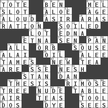 ACROSS 1. Haul 5. Benjamin's nick name 8. Cartoonist voice _ Blanc 11. Narrow, elongated depression 12. _ vera 14. Personal question 15. Verbally 17. SW Saudi Arabia district 18. Ancient river in northeast Turkey 19. Food allowance for one day 21. Dirtied 23. Car dealer's back yard 25. Pulitzer Prize-winning author Ferber 26. Inactive volcano in Sicily 27. Elected rep. 28. Baking dish 31. Everything 33. Globe 35. Boozer 37. Mountain range southwest of Kyrgyzstan 38. Petroleum 40. Toward shelter 41. Makes less strong or intense 43. ___ Haven, CT 45. Afternoon social gathering 46. "We ___ not amused" (Victoria) 47. Compass dir. 50. Soft 52. Comedian Laurel of Laurel & Hardy 53. One of the 12 tribes of Israel 54. College paper 56. Full of chinks, cracks, or crevices 61. Family _ (genealogy) 62. Naked 65. Eating place 66. Wind 67. Beverages made from leaves 68. Instrument 69. Two (Sp.) 70. Color 71. Perceives with the eye DOWN 1. Russian ruler of old 2. Spanish pot 3. A blast of a horn 4. Needle holder 5. Sound made by sheep 6. Raised railways 7. Annoying sounds 8. Female horse 9. Mild oath 10. French article 13. Eat (away) 16. Stupid person 18. Insect wing 20. Words to Nanette 22. Lodging establishments 24. Pacific island yam 26. Writer Wiesel 28. Whine 29. At sea 30. Born 31. Having or resembling wings 32. Unable to walk 34. Storage container 36. Pledge 37. "One Day ___ Time" 39. Grant temporary use of 42. Fast planes 44. Put on (as clothing) 48. Virtuous person 49. Took place subsequently 51. In a ____ (agitated or irritated) 52. Observe 54. Musical group of three 55. Possessive pronoun 57. Floor protectors 58. Mitch Miller's instrument 59. A type of plum 60. Snakelike fish 61. Bit 63. 24 hours 64. Compass dir.