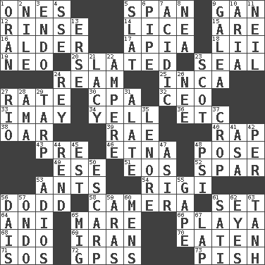 ACROSS 1. Singles 5. Connect, as a bridge 9. Separate the seeds from cotton 12. Remove soap 14. Louse (plural) 15. "We ___ not amused" (Victoria) 16. Tree or shrub in the Birch family 17. Capital of Western Samoa 18. Cards in a Roman deck? 19. Modern: prefix 20. Scheduled 23. Lick closed 24. 480, 500 or 516 sheets of paper 25. South American Indian 27. Pace 30. Accounting whiz (abbr.) 32. Corporate head (abbr.) 33. "If ____ say so..." 34. Shout 36. And so on (abbr.) 38. Boat paddle 39. Actress Charlotte 40. Reproach for some lapse or misdeed 43. Before (prefix) 46. Inactive volcano in Sicily 48. Airs 49. Compass dir. 51. Greek goddess of the dawn 52. Practice fight 53. Pismires 54. Swiss mountan, "Queen of the Mountains" 56. Texas town _ City 58. Device for capturing images 61. Arrange properly for use 64. Cuckoo 65. Female horse 66. Beach, in Buenos Aires 68. Wedding promise 69. SW Asia republic 70. Consumed 71. Distress signal 72. Global Positioning Systems (abbr.) 73. Expression of disdain DOWN 1. NW Algerian seaport 2. Mediterranean tributary 3. Inside; within (prefix) 4. Compass dir. 5. Narrow board 6. Corncob 7. Being or containing an acid 8. Teachers' org. 9. An organ shaped like a helmet 10. Operatic vocal solo 11. Famous astronaut Armstrong 13. Celtic language 21. Made of lace 22. Electrical Unit 23. Native of Scotland 24. Marina Del _, California 26. Born 27. _ de Janeiro 28. Housemaid (var.) 29. Canvas cover 31. Having winglike extensions 35. Poe poem 37. Riding implement 41. White ___ sheet 42. For each 44. Tear apart 45. Eastern Standard Time (abbr.) 47. SW Saudi Arabia district 48. Air pressure measure (abbr.) 50. Fortification 53. Goodbye (Sp.) 55. Open wide 56. Raised platform 57. Southwest Nigerian state 59. Ancient river in northeast Turkey 60. Not women's 61. Suttee (variant) 62. Snake ____ (dice throw) 63. Hyperbolic tangent 65. Russian fighter aircraft 67. Pet locale