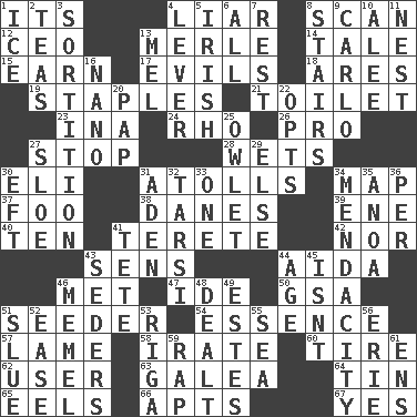 ACROSS 1. ___ a Wonderful Life 4. One who doesn't tell the truth 8. Examine minutely or intensely 12. Corporate head (abbr.) 13. Haggard of country music 14. Story 15. Merit 17. Vices 18. Ancient Greek god of war 19. Paper fasteners 21. Bathroom 23. _ tizzy (2 wds.) 24. 17th letter of the Greek alphabet 26. Adept person 27. Constrict 28. Moistens 30. Connecticut Ivy Leaguer 31. Ringlike coral islands and reefs 34. Atlas unit 37. Egg _ yung 38. Natives or inhabitants of Denmark 39. Compass dir. 40. "___ Little Indians" 41. Cigar-shaped 42. And not 43. Elected reps. 44. Opera by Verdi 46. Was introduced to 47. Binary compound 50. Girls' org. (abbr.) 51. Sowing specialist 54. Gist 57. Unable to walk 58. Feeling or showing extreme anger 60. Become fatigued 62. One who makes use of a thing 63. An organ shaped like a helmet 64. Shallow baking pan 65. Snakelike fish 66. Flats, for short 67. It is so DOWN 1. Frozen water 2. Beverages made from leaves 3. Determination 4. Prying instrument 5. From or relating to Ireland 6. Everything 7. Repose 8. Flight of steps 9. Monte _, Las Vegas Hotel/Casino 10. Toward shelter 11. Egg locale 13. Cartoonist voice _ Blanc 16. Billionth: prefix 20. Infant food 22. Chooses 25. A small or young owl 27. A type of plum 29. Otherwise 30. Newt 31. Arabian gulf 32. Tarsus (plural) 33. Single 34. Ananias' fault 35. Small Philippine buffalo 36. For each 41. Wig 43. Spring feasts 44. Ripen 45. Is not 46. Klaipeda city 48. Started a card game 49. _____ Park, CO 51. Turn sharply 52. Relaxation 53. Port city in Latvia 55. Ocean 56. One of the Great Lakes 59. Reproach for some lapse or misdeed 61. Followers of ems