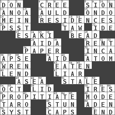 ACROSS 1. Spanish title 4. Algonquian 8. The Jewish people; Israel 12. Small Philippine buffalo 14. Old (Scot.) 15. Southwest Nigerian state 16. Chow _ 17. Homes 20. Inconspicuous attention getter 21. The 23rd letter of the Hebrew alphabet 22. Binary compound 23. 1973 Nobel Price Winner (Physics) Leo 27. Necklace unit 29. Opera by Verdi 31. Monthly bill 34. Some stationery 35. South American Indian 36. Domed church section 39. Assist 41. Smallest unit of an element 42. Songbird 43. Ingested 46. Grant temporary use of 47. One who doesn't tell the truth 48. At sea 51. Having lost freshness 54. Sep. follower 56. Hat (slang) 58. Angers 61. Conciliate 66. Method 67. Edible starchy tuberous root 68. Surprise greatly 69. Arabian gulf 70. System (abbr.) 71. Smile enhancers 72. Conclude DOWN 1. Moist 2. Singles 3. Annoying sound 4. 4-wheeled motor vehicle 5. Regret 6. Raised railways 7. Prepare for publication 8. Boy, to dad 9. Happening 10. Wrote a lyric poem 11. Sense of smell 13. Pismires 18. Small moist lump or mass 19. She-sheep 24. Auto club (abbr.) 25. Monetary unit of Laos 26. It may be bright or harebrained 28. Believer in; advocate of (suffix) 30. Satellite of Uranus 32. Non-commissioned officer (abbr.) 33. Scottish cap 34. Depends 36. Leather borer 37. Before (prefix) 38. Legislators 40. Raised platform 44. Make lace 45. Period 49. Biblical high priest 50. Small island 52. Pale green bean 53. Eat (away) 54. Elects 55. Supercomputer manufacturer 57. Compact _ 59. Paradise 60. Post 62. Cooking vessel 63. "One Day ___ Time" 64. Uncastrated adult male sheep 65. Followers of ems