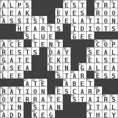 ACROSS 1. High mountains 5. Eastern Standard Time (abbr.) 8. Three (prefix) 11. Path through which fluid escapes 12. Nights before holidays 13. Friend of Pooh 14. Help 17. Conveyance 19. Centers 21. Foolish or stupid persons 22. Turn sharply 23. Turn to the right 24. Adept person 27. Portable shelter 29. Police officer (slang) 32. Musical pauses 34. 24 hours 36. Lick closed 37. Yard entry 38. Make supply last 39. Otherwise 40. Toward the sea 41. Lair 42. An organ shaped like a helmet 43. Area sheltered from the wind 44. Play the lead 46. Double-curved letter 47. Had dinner 50. Collude with 52. Food allowance for one day 55. Fortification 57. Make much ado about nothing 59. Flight of steps 62. Shallow baking pan 63. Comedian Laurel of Laurel & Hardy 64. Slanted text style (abbr.) 65. Find the sum of 66. Barrel 67. Those things DOWN 1. Chicken ___ king 2. French article 3. Romantic infatuation 4. Atmospheres 5. First lady 6. Major League Baseball Commissioner Bud 7. Sadhe (variant) 8. Musical group of three 9. Carrot, for example 10. Charged particles 12. Begley and Asner 15. Table seasonings 16. Loyal 18. Make a knot 20. Watched over 24. Therefore, facetiously 25. Stop 26. First name in cosmetics 28. Proceeds 29. Cell (Danish) 30. Fertile tracts in a desert 31. Entreaties 33. Beverage made from leaves 35. Gossips 36. Ocean 42. Relatively large 45. Lettered men learn these first 47. Wind 48. Cod relative 49. Related on the mother's side 51. Distinguishing feature 52. Round or rotation of duties 53. Enthusiastic 54. Watch over 55. Car or cant ending 56. Heart or essence 58. Label 60. Actress Charlotte 61. Secret