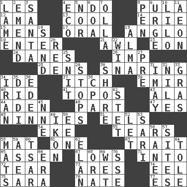 ACROSS 1. French article 4. Inside; within (prefix) 8. Monetary unit of Botswana 12. Wet nurse (var.) 13. Calm and collected 14. One of the Great Lakes 15. Not women's 17. Taken by mouth 18. White American of non-Hispanic descent 19. Keyboard key 21. Leather borer 23. Age 24. Natives or inhabitants of Denmark 26. Mischievous child 28. Lairs 30. Catching in a trap 34. Binary compound 37. Hankering 39. Independent ruler or chieftain 40. To free from 41. Traditional theme or motif 43. Chicken ___ king 44. An important port of Yemen 46. Piece 47. Consenting reply 48. Fools 51. Snakelike fish 54. Make supply last 55. Lacerates 58. Floor protector 61. Single 63. Distinguishing feature 65. NE Netherlands city 67. Coldest temperatures 71. To the inside or interior of 72. Rend 73. Ancient Greek god of war 74. Snakelike fish 75. "Two Mules for Sister ____" 76. Nathan's nickname 77. Compass dir. DOWN 1. Unable to walk 2. Make improvements or corrections to 3. Before Barbara or Clara 4. Environmental prefix 5. Or not 6. ___ good deed 7. Rounded earthenware pot or jar 8. Fenced enclosure 9. Goad 10. _ and Stitch 11. Age 16. Transmit 18. _ mater 20. To separate or throw off 22. Acquire through effort 25. In a ____ (agitated or irritated) 27. Before (prefix) 29. Halts 30. Dinah or Pauly 31. "If ____ say so..." 32. The longest river in the world 33. Pate de foie ____ 34. SW Asia republic 35. "You Light Up My Life" star Conn 36. Locale of original sin 38. Tax preparer (abbr.) 42. Proofreading order 45. Compass dir. 49. Picture 50. Car or cant ending 52. Allow 53. Indian skirt 56. Indian princess (variant) 57. Settings 58. Floor coverings 59. At sea 60. Russian ruler of old 62. Liveliness 64. Lacquered or enameled metalware 66. Period 68. Mouth or opening 69. Dripping 70. Compass dir.