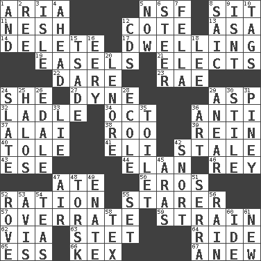 ACROSS 1. Roberta Peters solo 5. Overdraft (abbr.) 8. Be seated 11. Soft 12. ____ d'Azur (French Riviera) 13. White ___ sheet 14. Keyboard key 17. Home 19. Artist's stands 21. Chooses 22. Have the gumption 23. Actress Charlotte 24. A female animal or person 27. Unit of force 29. Cleo's killer 32. Dipping utensil 34. Sep. follower 36. Opposed to 37. Jai ____ 38. Friend of Pooh 39. It's straight from the horse's mouth 40. Lacquered or enameled metalware 41. Biblical high priest 42. Lacking originality or spontaneity 43. Compass dir. 44. Flair 46. Marina Del _, California 47. Had dinner 50. Greek god of love 52. Food allowance for one day 55. A viewer who gazes fixedly 57. Make much ado about nothing 59. Put through a sieve 62. By way of 63. Proofreading order 64. Travel on an animal 65. Double-curved letter 66. Dry husk or covering 67. Afresh DOWN 1. Also 2. Portuguese money of account (variant) 3. Small island 4. Having the leading position 5. Immediately 6. Guide 7. Chap (slang) 8. Ketch in the Levant 9. Is not 10. Labels 12. Music discs 15. Sadhe (variant) 16. Suggestive of the supernatural 18. Area sheltered from the wind 20. Poe poem 24. Chalkboard 25. Radiant circles of light 26. Peak District village in England 28. Learning spot: Fr. 29. Approach 30. Vertical member of a panel or frame 31. Abounding in pines 33. Whopper 35. Bathroom 36. Tate display 42. Derisive sound 45. Caspian sea tributary 47. Atmosphere 48. Cod relative 49. Related on the mother's side 51. Father Junipero _ 52. Be footloose 53. Opinion 54. Afternoon social gatherings 55. Put into a specified state 56. Water falling in drops from the sky 58. John Ritter's dad 60. Binary compound 61. ___ Haven, CT
