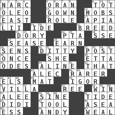 ACROSS 1. Drug cop 5. Northwest Algerian city 9. Small child 12. Butter sub 13. Bride's dress 14. Crowds into 15. Compass direction 16. Hero or heavy, e.g. 17. Capital of Western Samoa 18. Cards in a Roman deck? 19. Binary compound 21. A special lineage 22. Dinghy 24. Parent Teacher Association (abbr.) 26. Compass dir. 27. Gospel singer Marvin 28. Merit 29. Elected reps. 30. Simple song 32. Mail 36. At one time in the past 37. A female animal or person 38. Singer James 39. Lyric poems 40. Place in a line 42. Not this but _ 43. Actor Baldwin 44. Less widely known 46. Raised railways 49. Floor protector 50. Russian composer Stravinsky 51. Country estate 53. To separate or throw off 54. Acquire through effort 57. Toward shelter 58. Trig term 61. Periodic rise and fall of the sea level 62. "You Light Up My Life" star Conn 63. Utensil 64. At sea 65. Double-curved letter 66. "60 Minutes" Commentator Rooney 67. Welt DOWN 1. Christmas carol 2. Mountain range southwest of Kyrgyzstan 3. Home 4. Small bed 5. Legendary monster 6. Friend of Pooh 7. Leather borer 8. Compass dir. 9. Drinks excessively 10. Off-Broadway awards 11. Sadhe (variant) 14. Spoil 19. Big collection agency 20. Colored 21. Bar 23. Fertile tracts in a desert 24. Eucharist need 25. Attempt to accomplish something 27. Transmit 28. Principle of right and wrong 29. "Barney Miller" actor Jack 31. Small island 32. Stone: prefix 33. Else 34. Play the lead 35. Make lace 40. Insect wing 41. One of the Great Lakes 43. Nanny (var.) 45. Grow older 46. Elude 47. Ms. Damita and namesakes 48. Bobsleighs 52. Luau accessory 53. Trust 55. It may be bright or harebrained 56. Anneal 58. R.R. building 59. Electrically charged atom 60. Lower and raise head in agreement 61. The 23rd letter of the Hebrew alphabet