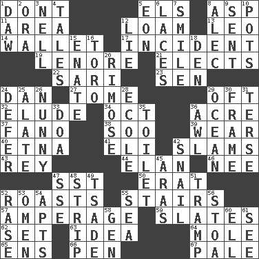 ACROSS 1. Do not 5. Raised railways 8. Viper 11. Length times width 12. Rich soil 13. Lion 14. Place for singles 17. Event 19. Poe poem 21. Chooses 22. Indian skirt 23. Elected rep. 24. One of the 12 tribes of Israel 27. Heavy book 29. Often (poetically) 32. Dodge 34. Sep. follower 36. 43,560 square feet 37. Papal veil 38. "Barney Miller" actor Jack 39. Put on (as clothing) 40. Inactive volcano in Sicily 41. Connecticut Ivy Leaguer 42. Criticizes harshly 43. Marina Del _, California 44. Flair 46. Born 47. Fast jet (abbr.) 50. Part of Q.E.F. 52. Ridicules or criticizes harshly 55. Flight of steps 57. Electrical Measurement 59. Chalkboards 62. Put into a specified state 63. The content of cognition 64. Undercover agent 65. Followers of ems 66. Fenced enclosure 67. Diluted with white DOWN 1. Fool 2. Mouth or opening 3. 1994 drama film starring Jodie Foster 4. Falsehoods 5. Period of immesurable duration 6. Shoestrings 7. Grin 8. Actor Baldwin 9. Emitted 10. Plant holders 12. Falsehood 15. Related on the mother's side 16. "Corrida" creature 18. Lair 20. Full of chinks, cracks, or crevices 24. Postpone 25. Having winglike extensions 26. Pet term 28. Learning spot: Fr. 29. Sea 30. Movie unit 31. Laconic 33. ___ good deed 35. Bathroom 36. Leather borer 42. Slow-paced one 45. Caspian sea tributary 47. Compass dir. 48. Remove all contents or possession from 49. Sadhe (variant) 51. _____ steamer (cargo ship) 52. To erase 53. Sign of something about to happen 54. Flats, for short 55. Ocean 56. Portico 58. Commissioned mil. rank 60. Pipe bend 61. Observe