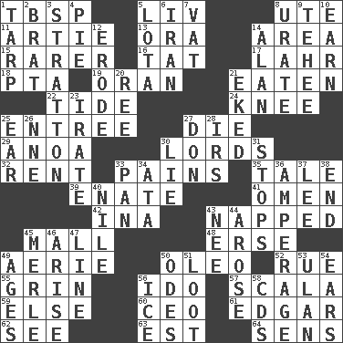 ACROSS 1. Cook's measure (abbr.) 5. 54 in ancient Rome 8. Shoshoni 11. Nick name for Arthur 13. Mouth or opening 14. Type of rug 15. More uncommon 16. Make lace 17. Cowardly lion portrayer 18. Parent Teacher Association (abbr.) 19. Northwest Algerian city 21. Ingested 22. Event that recurs at intervals 24. Leg joint 25. Main course 27. Expire 29. Small Philippine buffalo 30. Domineers 32. Monthly bill 33. Aches 35. Story 39. Related on the mother's side 41. Sign of things to come 42. _ tizzy (2 wds.) 43. Slept 45. Shopping center 48. Celtic language 49. Nest on high 50. Margarine 52. Regret 55. Smile widely 56. Wedding promise 57. Any of the three canals of the cochlea 59. Otherwise 60. Corporate head (abbr.) 61. _ Allan Poe 62. Observe 63. Eastern Standard Time (abbr.) 64. Elected reps. DOWN 1. Canvas cover 2. Naughty child 3. Ski resort town in Vermont 4. Sliced dessert 5. Globular water bottle used in Asia 6. SW Asia republic 7. Large container 8. A salt of uric acid 9. Giggle 10. Merit 12. Eat (away) 14. ____ Jay Lerner 20. To sift 21. Made supply last 23. Feeling or showing extreme anger 25. Hearing organ 26. Compass dir. 27. Spanish title 28. Big collection agency 30. Whopper 31. Obstructs or blocks passage 33. Baking dish 34. _ moment's notice (2 wds.) 36. Electrical Measurement 37. Area sheltered from the wind 38. Conclusion 40. "Death on the ____" 43. Born 44. Came up 45. Haggard of country music 46. Originate 47. Actor's bit 49. Eras 50. Lyric poems 51. Plunder 53. ____ Bator 54. Hearing organs 56. Frozen water 58. Music discs