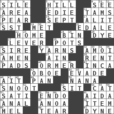 ACROSS 1. Drop; flow; fall 5. Land elevation 9. Perceive with the eye 12. Type of rug 13. Singer Brickell 14. Scottish caps 15. Lightbulb-shaped fruit 16. Back-to-school mo. 17. Came down and settled, as after flight 18. Fast jet (abbr.) 19. Was introduced to 21. Peak District village in England 22. Dwelling 24. Storage container 26. Color 27. Crowbar 28. Plant holders 29. Male parent of an animal 30. Entertaining tales 32. Mine, in Marseilles 36. So be it 37. The 18th letter of the Arabic alphabet 38. Monthly bill 39. Groovy apts. 40. Channel Islands abalone 42. South American Indian 43. Mitch Miller's instrument 44. Dodge 46. Small island 49. Baking dish 50. Grandmother 51. Snob 53. Be seated 54. Domesticated feline 57. Suttee (variant) 58. Inside; within (prefix) 61. Opera by Verdi 62. Of or related to the anus 63. Small Philippine buffalo 64. A distinct part 65. Cartoonist voice _ Blanc 66. Pull into pieces 67. Centimeter-gram-second unit of force DOWN 1. Plant excrements 2. Angers 3. Tough but pliablecoriaceous 4. Ewer handle 5. Command 6. Binary compound 7. Mouth edge 8. Allow 9. Vegetable dish 10. Poet Dickinson 11. First name in cosmetics 14. Small boy 19. Madame (abbr.) 20. Suggestive of the supernatural 21. Followers of ems 23. Baking chambers 24. Child's nurse 25. ___ a Wonderful Life 27. Pale green bean 28. A-one 29. Plant excrement 31. Composer Copland 32. Believer in; advocate of (suffix) 33. Ananias' fault 34. Single time 35. Call ___ day 40. Chief or king in Benin or Nigeria 41. Painter Guido (1575-1642) 43. Elect 45. Large container 46. Indian state 47. Silly 48. "_____ Recall" 52. Petroleum 53. Fly high 55. Arabian gulf 56. Docile 58. Consume 59. Compass dir. 60. ___ good deed 61. Help