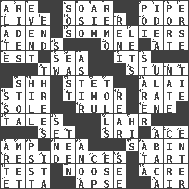 ACROSS 1. "We ___ not amused" (Victoria) 4. Fly high 8. Corncob 12. Not recorded 14. Flexible twig of a willow tree 16. Aroma 17. Arabian gulf 18. Wine waiters 20. Watches over 22. Single 23. Had dinner 24. Eastern Standard Time (abbr.) 25. Ocean 28. It is 30. It was, poetically 31. Check the growth or development of 35. Quiet! 37. Proofreading order 40. Jai ____ 41. Agitate 42. The easternmost of the Lesser Sundas 44. Pace 45. Flatfish 46. General guideline 47. Compass dir. 48. Falsehoods 50. Cowardly lion portrayer 52. Put into a specified state 54. _ Lanka 55. Adept person 58. Electrical Unit 61. Teachers' org. 63. Unit of acoustic absorption 65. Dwellings 70. Small pie 71. Trial 72. Trap for birds or small mammals 73. 43,560 square feet 74. Singer James 75. Domed church section 76. Wind DOWN 1. Having winglike extensions 2. Amusement-park features 3. Happening 4. Distress signal 5. Bear (Spanish) 6. Direct toward a target or goal 7. San ____ (Riviera town) 8. Luau course 9. The content of cognition 10. Left side of a ship or aircraft 11. Celtic language 13. Conclude 15. Painter Guido (1575-1642) 19. Allows 21. Compass dir. 26. 90 degrees 27. Being in motion 29. A viewer who gazes fixedly 30. Triplets 32. ____ Bator, Mongolia 33. Nathan's nickname 34. Neckwear 35. Portico 36. Land elevation 38. Australian flightless bird 39. For Whom the Bell _____ 41. Fast jet (abbr.) 43. Buttocks 49. Transmit 51. Part of HMS, perhaps 53. Adolescent 55. Phillipine bananalike plant 56. High-altitude cloud 57. Keyboard key 58. Johnson of "Laugh-In" 59. Rendezvous 60. Inconspicuous attention getter 62. Small Philippine buffalo 64. _ moment's notice (2 wds.) 66. Call ___ day 67. Police officer (slang) 68. Curvy letter 69. Observe