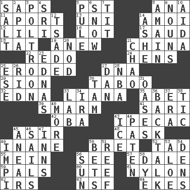 ACROSS 1. Plant excrements 5. Pacific Standard Time (abbr.) 8. Santa ___, CA 11. To the left, to Queeg 13. Corn or form start 14. Mine, in Marseilles 15. Ms. Damita and namesakes 16. Car dealer's back yard 17. Saudi Arabian king (1953-1964) 18. Make lace 19. Afresh 21. Large country 22. Make new 24. Coop moms 25. Eaten away 27. Heredity factor (abbr.) 29. The Jewish people; Israel 30. Off limits 32. Pulitzer Prize-winning author Ferber 33. Woody, climbing, usually tropical plant 35. Collude with 39. Excessive but superficial compliments 41. Indian skirt 42. Chief or king in Benin or Nigeria 43. Medicinal drug used to evoke vomiting 45. SW Saudi Arabia district 48. Keg 49. Silly 50. Cy Young winner Saberhagen 52. Small amount or degree 55. Count _ (2 wds.) 56. Observe 57. Peak District village in England 59. Friends 60. Shoshoni 61. High-strength synthetic material 62. Big collection agency 63. Science/research agcy. 64. Supplements with great effort DOWN 1. Table seasoning 2. Capital of Western Samoa 3. Characterized by complete cowardliness 4. _ Lanka 5. Whine 6. Frozen precipitation 7. Teat (slang) 8. With great haste 9. Parts of speech 10. Opera by Verdi 12. Sadhe (variant) 14. American tennis player Robert 20. Lower and raise head in agreement 21. US Secretary of Labor Elaine L. _ 23. Ferber et al. 25. Compass dir. 26. To free from 27. Daniel's nick name 28. Basketball assoc. 30. Scottish cap 31. Fertile tracts in a desert 33. Experiment locale 34. Lyricist Gershwin 36. Sass 37. Epoch 38. Nervous spasm 40. Greater amount 43. Frozen water 44. Eucharist need 45. Approach 46. Moves on water 47. Taverns 49. Body of Kaffir warriors 50. Antes 51. Coral ridge 53. Medicinal plant 54. Hiding places for outlaws 56. Player for Phoenix 58. Color