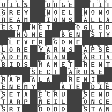 ACROSS 1. Lubricates 5. Goad 9. Teat (slang) 12. Jennifer or Joel 13. Christmas carol 14. Words to Nanette 15. 480, 500 or 516 sheets of paper 16. Charged atoms 17. Silent film actress Nazimova 18. Eastern Standard Time (abbr.) 19. Was introduced to 21. Stared 22. Residence 24. Benjamin's nick name 26. Filthy place 27. Prying instrument 28. Went 29. Old wives' tales, e.g. 30. Tall tales 32. Domed church section 36. Arabian gulf 37. Forbid 38. Roberta Peters solo 39. Auction offers 40. French painter Edouard 42. Monthly bill 43. Religious group 44. Came up 46. Strike 49. According to 50. Painter Guido (1575-1642) 51. Foe 53. Had dinner 54. Pass on 57. Bristle 58. Shade of tan 61. Transmit 62. Canvas cover 63. Famous astronaut Armstrong 64. At one time in the past 65. _ Lanka 66. Texas town _ City 67. Comedian Laurel of Laurel & Hardy DOWN 1. Legendary monster 2. Angers 3. Tough but pliablecoriaceous 4. Symbol (abbr.) 5. A single undivided whole 6. Friend of Pooh 7. Commissioned mil. rank 8. Raised railways 9. For Whom the Bell _____ 10. An arm off of a larger body of water 11. Sycophant 14. Tired old horse 19. Madame (abbr.) 20. Suggestive of the supernatural 21. Single 23. Baking chambers 24. Maid-servant 25. Followers of ems 27. Farming town in central California 28. Let have 29. Experiment locale 31. Phillipine bananalike plant 32. Composer Copland 33. Elected leader of a country 34. Trig term 35. Erode 40. Cartoonist voice _ Blanc 41. Small pie 43. Declare 45. Portuguese money of account (variant) 46. Musical pauses 47. Approach 48. _ dish (used to culture cells) 52. Atlas unit 53. Old (Scot.) 55. South American Indian 56. Genesis locale 58. Conclude 59. Corporate head (abbr.) 60. To free from 61. Mayday