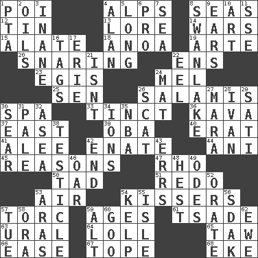 ACROSS 1. Luau course 4. High mountains 8. Oceans 12. Metal container 13. Old wives' tales, e.g. 14. Armed conflicts 15. Having winglike extensions 18. Small Philippine buffalo 19. Johnson of "Laugh-In" 20. Catching in a trap 22. Followers of ems 23. The front part of a cuirass 24. Cartoonist voice _ Blanc 25. Elected rep. 26. Deli grouping 30. Health resort 33. Tinged 36. Polynesian shrub of the pepper family 37. Compass direction 39. Chief or king in Benin or Nigeria 40. Part of Q.E.F. 41. Toward shelter 42. Related on the mother's side 44. Cuckoo 45. Thinks logically 47. 17th letter of the Greek alphabet 50. Small amount or degree 51. Do over again 53. Atmosphere 54. Smoochers 57. Torque (variant) 59. Ripens 61. Sadhe (variant) 63. Mountain range 64. Hang loosely or laxly 65. The 23rd letter of the Hebrew alphabet 66. Relaxation 67. Drink excessively 68. Make supply last DOWN 1. Parent Teacher Assoc. 2. Lubricates 3. Silly 4. Actor Alda or Thicke 5. Having great length 6. Adept person 7. Ocean 8. Tchaikovsky ballet 9. Hearing organs 10. Tate display 11. Compass dir. 16. Labels 17. 4th largest of the Great Lakes 21. Is not 22. Snakelike fish 24. Floor covering 26. Leave at once 27. Hindu Mythology: god of death 28. _ the terrible 29. Suttee (variant) 30. Burn superficially 31. Diluted with white 32. Toward the sea 34. Charged atoms 35. Basketball assoc. 38. One of the two male reproductive glands 42. Conclude 43. Blunders 46. Boat paddle 48. Behest 49. Lyric poems 52. Speak pompously 53. Ancient river in northeast Turkey 54. Seaweed 55. Capri or Wight 56. Neighbor of Neb. 57. Third day of the wk. 58. Mouth or opening 59. The first octave above the treble staff 60. Thick or sticky substance 62. She-sheep