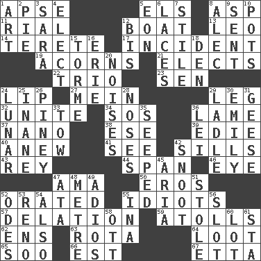 ACROSS 1. Domed church section 5. Raised railways 8. Cleo's killer 11. Monetary unit of Yemen 12. Water vessel 13. Lion 14. Cylindrical with tapered ends 17. Happening 19. Oak nuts 21. Opts 22. Musical group of three 23. Elected rep. 24. Mouth edge 27. Count _ (2 wds.) 29. Part of a journey 32. Join together 34. Distress signal 36. Unable to walk 37. Billionth: prefix 38. Compass dir. 39. Singer Brickell 40. Afresh 41. Perceive with the eye 42. Beverly of Met fame 43. Marina Del _, California 44. Connect, as a bridge 46. Sight organ 47. Wet nurse (var.) 50. Greek god of love 52. Spoke pompously 55. Foolish or stupid persons 57. Conveyance 59. Ringlike coral islands and reefs 62. Followers of ems 63. Roll call or roster of names 64. Spoils 65. "Barney Miller" actor Jack 66. Eastern Standard Time (abbr.) 67. Singer James DOWN 1. Tate display 2. Sliced dessert 3. "Two Mules for Sister ____" 4. Opt 5. Period of immesurable duration 6. Shoestrings 7. Vertical member of a panel or frame 8. Actor Baldwin 9. Transmitted 10. Cooking vessels 12. Twice 15. Singer Mel 16. 4th largest of the Great Lakes 18. Lair 20. Annoying sounds 24. Type of eclipse 25. Empty; void 26. Abounding in pines 28. Olfactory organs 29. Dipping utensil 30. Poet Dickinson 31. Honkers 33. Pull behind 35. Oozed 36. Flowery wreath 42. Snout, nose 45. Operatic vocal solo 47. _ moment's notice (2 wds.) 48. Distance measurement (Brit.) 49. Goodbye (Sp.) 51. Fur scarf 52. Lyric poems 53. Former U.S. Attorney General Janet 54. In addition 55. _ tizzy (2 wds.) 56. Slit 58. Baseball player Mel 60. Car dealer's back yard 61. R.R. building