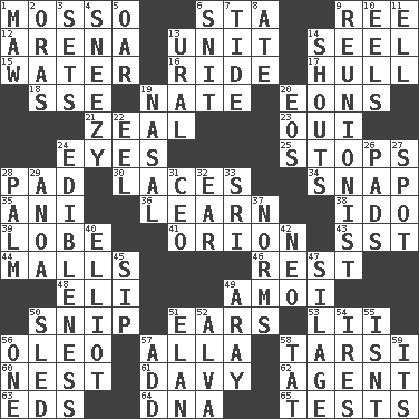 ACROSS 1. With motion or animation 6. R.R. building 9. To riddle 12. Sports stadium 13. A single undivided whole 14. Stitch closed the eyes of (a falcon) 15. Wetness 16. Travel on or in a vehicle 17. Frame or body of a ship 18. Compass dir. 19. Nathan's nickname 20. Immeasurably long periods of time 21. Ardor 23. Fr. "Yes" 24. Sight organs 25. Ceases 28. Groovy apt. 30. Shoestrings 34. Fastener 35. Cuckoo 36. Acquire or gain knowledge or skills 38. Wedding promise 39. Ear part 41. Constellation of myth 43. Fast jet (abbr.) 44. Shopping centers 46. Remainder 48. Biblical high priest 49. Mine, in Marseilles 50. Sever or remove by pinching or nipping 51. Hearing organs 53. Cards in a Roman deck? 56. Margarine 57. Silent film actress Nazimova 58. Tarsus (plural) 60. A home for chicks 61. _ Jones' Locker 62. Representative 63. Begley and Asner 64. Heredity factor (abbr.) 65. Trials DOWN 1. Informal term for the mouth 2. Mouths or openings 3. Puts into a specified state 4. Dwarf with a sinus problem 5. Boat paddle 6. In a ____ (agitated or irritated) 7. Periodic rise and fall of the sea level 8. Had dinner 9. One who advocates reunion 10. Snakelike fish 11. Pipe bend 13. Mountain range 14. Yells 19. Relating to the nose 20. Greek goddess of the dawn 22. Snakelike fish 24. The property of being fit to eat 26. Writing tablets 27. Specific locale 28. Inside of hand 29. Small Philippine buffalo 31. Corporate head (abbr.) 32. Hearing organ 33. _ Lanka 37. Typical standards 40. American author Paul (1891-1958) 42. Modern: prefix 45. Small drink 47. Fodder prepared in a silo 49. Like ___ of sunshine 50. Downhill vehicle 51. Enthusiasm 52. Inventor's middle name 54. Angers 55. Is not 56. Single 57. Find the sum of 58. Make lace 59. It is