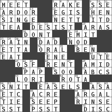 ACROSS 1. Rendezvous 5. Libertine 9. Compass dir. 12. Zeal 14. The front part of a cuirass 15. Layer 16. Burn superficially 17. Remaining after all deductions 18. It would 19. Beverage made from leaves 20. Stop 23. Caspian sea tributary 24. Do not 25. Send forth 27. Precipitation 30. June honoree 32. Allow head to fall sleepily 33. Singer James 34. Taken by mouth 36. Benjamin's nick name 38. Ingest 39. Compass dir. 40. Shoshoni 43. Order of Saint Francis (abbr.) 46. Monthly bill 48. Among 49. Infant food 51. "Barney Miller" actor Jack 52. Lettered men learn these first 53. Australian parrot (variant) 54. Roll call or roster of names 56. In a ____ (agitated or irritated) 58. Artist's stands 61. White ___ sheet 64. And so on (abbr.) 65. Land measure 66. Therefore, facetiously 68. Standoff 69. Ooze 70. Wash lightly 71. Fast jet (abbr.) 72. Inconspicuous attention getter 73. Plate DOWN 1. Vertical spar for supporting sails 2. One of the Great Lakes 3. Pulitzer Prize-winning author Ferber 4. Coat; cloak 5. Painter Guido (1575-1642) 6. Ripens 7. Baby cat 8. Eastern Standard Time (abbr.) 9. Chest covering 10. Bristle 11. Extremities 13. Redecorate 21. Inside; within (prefix) 22. A viewer who gazes fixedly 23. Assistant 24. Heredity factor (abbr.) 26. Disorderly crowd 27. Portuguese money of account (variant) 28. _ moment's notice (2 wds.) 29. "Tell ____ the Marines!" 31. Natives or inhabitants of Denmark 35. Poe poem 37. Unfeeling 41. Nervous spasm 42. Begley and Asner 44. Specific locale 45. Distant 47. Implement 48. American Automobile Association (abbr.) 50. Components 53. It is permitted: Lat. 55. Russian ruler of old 56. Puts into a specified state 57. Nuclear Threat Initiatives 59. Ancient Greek god of war 60. Back-to-school mo. 61. Hindu god of fire 62. Backtalk 63. Actor Baldwin 65. Viper 67. To free from