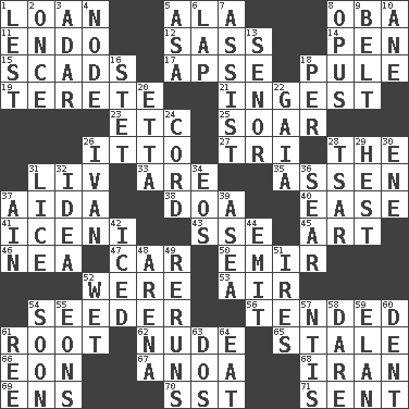 ACROSS 1. Grant temporary use of 5. According to 8. Chief or king in Benin or Nigeria 11. Inside; within (prefix) 12. Backtalk 14. Animal enclosure 15. Large numbers or amounts 17. Domed church section 18. Whimper 19. Cylindrical with tapered ends 21. Consume 23. And so on (abbr.) 25. Fly high 26. "Tell ____ the Marines!" 27. Three (prefix) 28. Definite Article 31. 54 in ancient Rome 33. "We ___ not amused" (Victoria) 35. NE Netherlands city 37. Opera by Verdi 38. ___ good deed 40. Relaxation 41. Ancient Celtic tribe of eastern Britain 43. Compass dir. 45. Nonscientific branch of learning 46. Teachers' org. 47. Automobile 50. Arab leader 52. Past tense of be (plural) 53. Atmosphere 54. Sowing specialist 56. Watched over 61. Carrot, for example 62. Unadorned 65. Having lost freshness 66. Period of immesurable duration 67. Small Philippine buffalo 68. SW Asia republic 69. Followers of ems 70. Fast jet (abbr.) 71. Emitted DOWN 1. For fear that 2. Single time 3. The sixth month of the Jewish calendar 4. Connecting point 5. White ___ sheet 6. Pet locale 7. Aid 8. Musical composition 9. Waist strap 10. A saturated hydrocarbon 13. Sir (Sp.) 16. Proofreading order 18. For each 20. Singer James 22. Greek goddess of the earth (variant) 24. Drawstring 26. "Terrible" tsar 28. Russian ruler of old 29. Behest 30. Compass dir. 31. Louse (plural) 32. The main thing one is thinking about 34. Greek goddess of the dawn 36. Wither 37. The 18th letter of the Arabic alphabet 39. Toward the sea 42. On the rocks 44. Give off 48. Sports stadium 49. Summer TV shows 51. Angers 52. Soggy 54. Within a short period 55. Immeasurably long periods of time 57. Nuclear Threat Initiatives 58. Have the gumption 59. Enthusiasm 60. Scratch 61. To sift 63. Two (Sp.) 64. Erode