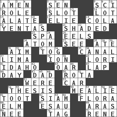 ACROSS 1. So be it 5. Elected rep. 8. _-fi 11. Hero or heavy, e.g. 12. Groove 14. Car dealer's back yard 15. Having winglike extensions 17. Writer Wiesel 18. Root beer relative 19. Gossips 21. Cast a shadow over 23. Health resort 25. Snakelike fish 26. Tiny particle 27. Observe 28. Had dinner 31. Direct toward a target or goal 33. Coat; cloak 35. Lessep's creation 37. Pale green bean 38. Electrically charged atom 40. Australian parrot (variant) 41. Potato state 43. Rowing implement 45. Infant locale 46. 24 hours 47. Male parent 50. Round or rotation of duties 52. Past tense of be (plural) 53. Auto 54. College paper 56. Ear of corn 61. A blast of a horn 62. Thailand, formerly 65. Plants 66. Shade tree 67. He sold his birthright 68. Caspian sea tributary 69. Born 70. Label 71. French philosopher Descartes DOWN 1. Like ___ of sunshine 2. Undercover agent 3. Style 4. Remaining after all deductions 5. Compass dir. 6. Pipe bend 7. Annoying sounds 8. _ gin 9. Having a low temperature 10. Call ___ day 13. Giggle 16. Compass direction 18. Music discs 20. Specific locale 22. Actor Baldwin 24. Mine, in Marseilles 26. Nursemaid 28. Small Philippine buffalo 29. Canvas cover 30. Biblical high priest 31. Opera by Verdi 32. "If ____ say so..." 34. Thick or sticky substance 36. Silent film actress Nazimova 37. Flaplike covering 39. Drug cop 42. Lyric poems 44. Wander aimlessly 48. Ascend 49. Cease 51. Unclean, religiously 52. Dripping 54. Lacquered or enameled metalware 55. Residence 57. Having or resembling wings 58. Old wives' tales, e.g. 59. SW Asia republic 60. Comfort 61. "___ Little Indians" 63. American Automobile Association (abbr.) 64. Large cup