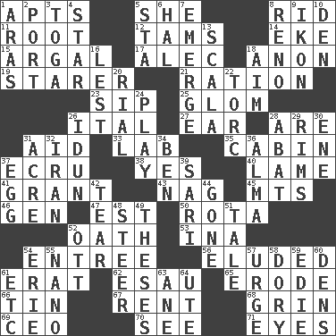 ACROSS 1. Tenement units (abbr.) 5. A female animal or person 8. To free from 11. Carrot, for example 12. Scottish caps 14. Make supply last 15. Therefore, facetiously 17. Actor Baldwin 18. Soon (poet.) 19. A viewer who gazes fixedly 21. Food allowance for one day 23. Small drink 25. Seize upon or latch onto something 26. Slanted text style (abbr.) 27. Ewer handle 28. "We ___ not amused" (Victoria) 31. Help 33. Experiment locale 35. Apartment or room in a ship 37. Shade of tan 38. Affirmative reply 40. Unable to walk 41. Monetary aid 43. Tired old horse 45. Mountains (abbr.) 46. Commissioned mil. rank 47. Eastern Standard Time (abbr.) 50. Round or rotation of duties 52. Pledge 53. _ tizzy (2 wds.) 54. Main course 56. Evaded 61. Part of Q.E.F. 62. Son of Isaac 65. Wear away 66. Shallow baking pan 67. Monthly bill 68. Smile widely 69. Corporate head (abbr.) 70. Perceive with the eye 71. Sight organs DOWN 1. Caspian sea tributary 2. Sweet dark-red dessert wine 3. Ancient Roman robe 4. Play the lead 5. R.R. building 6. Actor Linden 7. Develop 8. Former U.S. Attorney General Janet 9. Visual representation of an object 10. Lair 13. Any of the three canals of the cochlea 16. For fear that 18. Direct toward a target or goal 20. Monetary unit of Yemen 22. Torque (variant) 24. Romp 26. Goddess of spring and wife of Bragi 28. Blind as ____ 29. Basketball hoops 30. Compass dir. 31. Measure of real estate 32. SW Asia republic 34. Benjamin's nick name 36. _ mater 37. Ovum 39. Indian skirt 42. Separate forcefully 44. Went 48. Navigate 49. College papers 51. Lie 52. Baseball player Mel 54. 4th largest of the Great Lakes 55. Billionth: prefix 57. Goad 58. Rowboat 59. Singer Brickell 60. Habitations of wild animals 61. And so on (abbr.) 63. A saturated hydrocarbon 64. Shoshoni