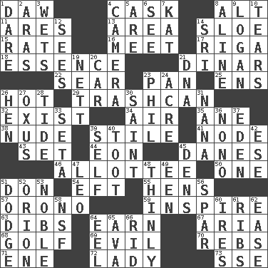 ACROSS 1. Simpleton 4. Keg 8. Keyboard modifier key 11. Ancient Greek god of war 13. Type of rug 14. _ gin 15. Pace 16. Confront 17. Port city in Latvia 18. Substance 21. Middle Eastern gold or silver currency 22. Wither 23. Baking dish 25. Followers of ems 26. Being at a high temperature 29. File 13 32. Have an existence 34. Wind 35. A saturated hydrocarbon 38. Naked 39. Vertical member of a panel or frame 41. Connecting point 43. Arrange properly for use 44. A really long time 45. Natives or inhabitants of Denmark 46. One to whom something is allotted 50. Single 51. Spanish title 54. Newt 55. Coop moms 57. U. of Maine site 59. Stimulate to action 63. Rights 64. Merit 67. Operatic vocal solo 68. _ course 69. Morally bad or wrong 70. Confederate soldiers (slang) 71. Compass dir. 72. Kenny Rogers chart-topper in '80 73. Compass dir. DOWN 1. Have the gumption 2. Ancient river in northeast Turkey 3. Soaks 4. Device for capturing images 5. "We ___ not amused" (Victoria) 6. Perceive with the eye 7. Krazy ___ of comics 8. Place in a line 9. Utah city north of Ogden 10. Pulls apart 12. Perceives with the eye 14. Indian title of respect (Mr.) 19. Remaining after all deductions 20. Auto 21. Heredity factor (abbr.) 23. Silvers or Donahue 24. 43,560 square feet 26. Layer 27. The longest river in Central Asia 28. Periodic rise and fall of the sea level 30. Virtuous person 31. Nanny 33. Bristle 36. Words to Nanette 37. Locale of original sin 39. Itself 40. A blast of a horn 42. Compass dir. 45. Hiding places for outlaws 47. Lion 48. Without thickness 49. Car or cant ending 51. Evade 52. Greek mythologigal hunter 53. Impressive in appearance 56. Coast Guard woman 58. Overdraft (abbr.) 60. Angers 61. Teases 62. Comfort 64. Snakelike fish 65. Actress Gardner 66. To free from