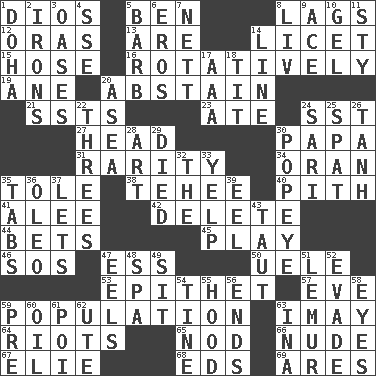 ACROSS 1. "Vaya con ____" 5. Benjamin's nick name 8. Fails to keep up a pace 12. Mouths or openings 13. "We ___ not amused" (Victoria) 14. It is permitted: Lat. 15. Flexible conduit 16. Happening in regular succession 19. One (Scot) 20. Choose not to consume 21. Fast planes 23. Had dinner 24. Fast jet (abbr.) 27. Froth on beer 30. Dad 31. Noteworthy scarcity 34. NW Algerian seaport 35. Lacquered or enameled metalware 38. Giggle 40. Essential or central part 41. Toward shelter 42. Erase 44. Stakes 45. Romp 46. Mayday 47. Curvy letter 50. Ubangi River tributary 53. Curse 57. Night before a holiday 59. Census information 63. "If ____ say so..." 64. Debaucheries 65. Allow head to fall sleepily 66. Unadorned 67. Writer Wiesel 68. Begley and Asner 69. Ancient Greek god of war DOWN 1. Capital of the state of Qatar 2. Metal shackles 3. Fertile tracts in a desert 4. Compass dir. 5. Sharp remark 6. Greek god of love 7. Remaining after all deductions 8. 54 in ancient Rome 9. Adept person 10. Set 11. Filthy place 14. Actor's bit 17. Auto club (abbr.) 18. Teat (slang) 20. At sea 22. Trios 24. Indian skirt 25. Petty quarrel 26. Hyperbolic tangent 28. Nonscientific branch of learning 29. Passed on 30. Wimpy's pal 32. Definite Article 33. Sharp bark 35. Bar bills 36. Butter sub 37. Allows 39. Snakelike fish 43. Strained 47. Snakelike fish 48. Health resort 49. Be seated 51. Arboreal primate 52. Elude 54. Prong on a fork 55. Parka part 56. Extremities 58. Snake ____ (dice throw) 59. Before (prefix) 60. Petroleum 61. Luau course 62. Shoshoni 63. _ tizzy (2 wds.)