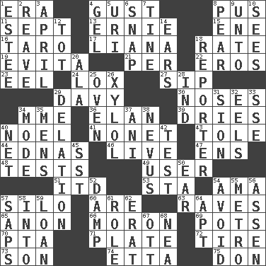 ACROSS 1. Period 4. Abrupt rush of wind 8. Fluid product of inflammation 11. Back-to-school mo. 13. Bert's buddy 15. Compass dir. 16. Pacific island yam 17. Woody, climbing, usually tropical plant 18. Assign a rank or rating to 19. Webber/Rice musical 21. For each 22. Greek god of love 23. Snakelike fish 24. Brine-cured salmon 27. Small drink 29. American folk hero Crockett 30. Olfactory organs 34. Madame (abbr.) 36. Enthusiasm 39. Frees from moisture 40. Christmas carol 41. Music written for nine 43. Lacquered or enameled metalware 44. Ferber et al. 46. Not recorded 47. Followers of ems 48. Trials 49. One who makes use of a thing 51. It would 53. R.R. building 54. Nursemaid (var.) 57. Grain storage tower 60. "We ___ not amused" (Victoria) 63. All-night dance parties 65. At once, immediately (arch.) 66. Person of subnormal intelligence 69. Plant holders 70. Parent Teacher Assoc. 71. Food holder 72. Hoop that covers a wheel 73. Boy, to dad 74. Singer James 75. Spanish title DOWN 1. First name in cosmetics 2. Rob, plunder, or pillage 3. Showery time 4. Set 5. RI univ. 6. Fastener 7. Prong on a fork 8. Lightbulb-shaped fruit 9. To (old English) 10. Perceives with the eye 12. Small child 14. Hearing organs 18. Newsperson 20. Wing 25. Baking chamber 26. Xylene (variant) 28. Working for oneself (abbr.) 29. Accusation by an informer 31. The Jewish people; Israel 32. Snakelike fish 33. Compass dir. 34. Method 35. Not women's 37. Black tropical American cuckoo 38. Congenital growth or mark on the skin 40. Fish or hair follower 42. Trial 45. Fast jet (abbr.) 50. Hearing organ 52. Moist 54. Stay clear from 55. Paris' subway 56. NE Netherlands city 57. Plant excrements 58. To the inside or interior of 59. Grant temporary use of 61. Hero or heavy, e.g. 62. Part of Q.E.F. 64. Fitting 67. Baseball player Mel 68. Teachers' org.
