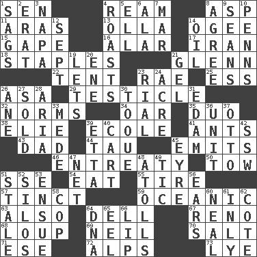 ACROSS 1. Elected rep. 4. 480, 500 or 516 sheets of paper 8. Viper 11. Caspian sea tributary 13. Rounded earthenware pot or jar 14. Double curve, resembling the letter S 15. Stare wonderingly 16. Having or resembling wings 17. SW Asia republic 18. Paper fasteners 21. American astronaut and politician John 22. Portable shelter 23. Actress Charlotte 25. Curvy letter 26. White ___ sheet 29. A testis 32. Typical models 34. Boat paddle 35. Superhero pair 38. Writer Wiesel 39. Learning spot: Fr. 41. Pismires 43. June honoree 44. The 19th letter of the Greek alphabet 45. Sends forth 46. Plea 50. Pull behind 51. Compass dir. 54. Consume 55. Become fatigued 57. Colored lightly or faintly 59. Pertaining to the sea 63. In addition 64. Small valley 67. Former U.S. Attorney General Janet 68. Central Nebraska county 69. Famous astronaut Armstrong 70. Table seasoning 71. Compass dir. 72. High mountains 73. Sodium hydroxide DOWN 1. Settles 2. Part of Q.E.F. 3. California wine valley 4. Ridicules or criticizes harshly 5. Pipe bend 6. In the manner of 7. Impair 8. Match 9. Seines 10. Actor Sean's family 12. Back-to-school mo. 14. Petroleum 19. Allows 20. Compass dir. 21. Set 23. Monetary unit of Yemen 24. Measure of real estate 26. A saturated hydrocarbon 27. Disposed of to a purchaser 28. Roberta Peters solo 30. Woman's close-fitting hat 31. Dutch treat 33. Ancient Persian 36. A single undivided whole 37. "Beetle Bailey" pooch 39. Singer James 40. Haul 42. Compass dir. 45. Jane of fiction 47. Fish or hair follower 48. Ringlike coral islands and reefs 49. Nervous spasm 51. Lacking originality or spontaneity 52. Grain storage towers 53. Take place subsequently 56. Hearing organs 58. Police officer (slang) 60. Anneal 61. In an inward manner 62. ____ d'Azur (French Riviera) 64. Heredity factor (abbr.) 65. Snakelike fish 66. Mouth edge
