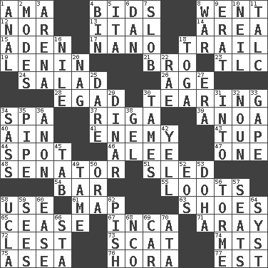 ACROSS 1. Nanny (var.) 4. Auction offers 8. Gone 12. Not either 13. Slanted text style (abbr.) 14. Length times width 15. Arabian gulf 17. Billionth: prefix 18. Go after with the intent to catch 19. Soviet premier 1918-24 21. Sis' sibling 23. Affectionate concern, for short 24. First course 26. Grow older 28. Mild oath 30. Pulling apart 34. Health resort 37. Port city in Latvia 39. Small Philippine buffalo 40. The 18th letter of the Arabic alphabet 41. Foe 43. Uncastrated adult male sheep 44. Blemish 46. Toward shelter 47. Single 48. Elected representative 51. Downhill vehicle 54. Oblong piece of solid material 55. Plunders 58. Purpose 61. Atlas unit 63. Imelda's hoard 65. Stop 67. South American Indian 71. Like ___ of sunshine 72. For fear that 73. Scram! 74. Mountains (abbr.) 75. At sea 76. Israeli folk dance 77. Eastern Standard Time (abbr.) DOWN 1. Of or related to the anus 2. Methods 3. Sports stadium 4. Storage container 5. Call ___ day 6. Daniel's nick name 7. Oscar Madison type 8. Armed conflict 9. Part of Q.E.F. 10. Famous astronaut Armstrong 11. Baby powder 16. Mediterranean tributary 18. Ancient Roman robe 20. Tired old horse 22. Actress Charlotte 25. Have the gumption 27. Period 29. Middle Eastern gold or silver currency 30. Domesticates 31. To the inside or interior of 32. Part of speech 33. Open wide 34. Backtalk 35. Corncob 36. At once, immediately (arch.) 38. Set 42. Shout 45. Keyboard key 49. Not wild 50. Mouth or opening 52. Greek goddess of the dawn 53. Capital of the state of Qatar 56. Singer Mel 57. Theater features 58. Southern CA. univ. 59. Observes 60. Comfort 62. Expression of disdain 64. System (abbr.) 66. R.R. building 68. Non-commissioned officer (abbr.) 69. 4-wheeled motor vehicle 70. _ moment's notice (2 wds.)