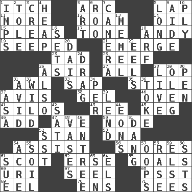 ACROSS 1. Hankering 5. Curve 8. Infant locale 11. Greater amount 12. Wander 14. Lubricate 15. Entreaties 17. Heavy book 18. Actor Griffith 19. Oozed 21. Develop 23. Bit 25. Coral ridge 26. SW Saudi Arabia district 27. 100% 28. Trim (branches) 31. Leather borer 33. Plant excrement 35. Vertical member of a panel or frame 37. Opinion 38. Set 40. Baking chamber 41. Grain storage towers 43. Portuguese money of account (variant) 45. Cask 46. Say or write further 47. "___ Maria" 50. Thickened enlargement 52. Comedian Laurel of Laurel & Hardy 53. Heredity factor (abbr.) 54. Aid 56. Sounds asleep 61. Native of Scotland 62. Celtic language 65. Finish lines 66. RI univ. 67. Sew up the eyelids of hawks and falcons 68. Inconspicuous attention getter 69. Snakelike fish 70. Followers of ems 71. Observes DOWN 1. Naughty children 2. Lacquered or enameled metalware 3. Algonquian 4. Pile 5. Tate display 6. Friend of Pooh 7. Device for capturing images 8. Yearn 9. Helper 10. Strand of rope, yarn or thread 13. Klaipeda city 16. Arranges properly for use 18. Sandy's bark 20. Raised platform 22. Snakelike fish 24. To be drawn or hauled along 26. In addition 28. Not recorded 29. Cassini of fashion 30. Writing instrument 31. Enthusiastic 32. Rampant 34. For each 36. Casino tip 37. White ___ sheet 39. Grant temporary use of 42. Suttee (variant) 44. Immeasurably long periods of time 48. Flower holders 49. Main course 51. Mild oath, euphamism for damn 52. Fast jet (abbr.) 54. 43,560 square feet 55. The visible part of the earth's surface 57. I made a mistake 58. Raze (variant) 59. Otherwise 60. Fast planes 61. Institute legal proceedings 63. Elected rep. 64. Raised railways