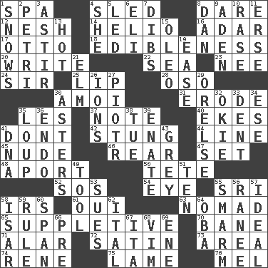 ACROSS 1. Health resort 4. Downhill vehicle 8. Have the gumption 12. Tender 14. Sun: prefix 16. The sixth month of the Jewish calendar 17. "Beetle Bailey" pooch 18. The property of being fit to eat 20. Compose 22. Ocean 23. Born 24. Title for a knight 25. Mouth edge 28. Bear (Spanish) 30. Mine, in Marseilles 31. Eat (away) 35. French article 37. Brief written record 40. Makes supply last 41. Do not 42. Feeling sharp psychological pain 44. Actor's bit 45. Naked 46. Bring up, as a child 47. Put into a specified state 48. To the left, to Queeg 50. False hair 52. Mayday 54. Sight organ 55. _ Lanka 58. Big collection agency 61. Fr. "Yes" 63. Wanderer 65. Supplementary 70. Object of repulsion 71. Having or resembling wings 72. Smooth fabric 73. Type of rug 74. French philosopher Descartes 75. Unable to walk 76. Cartoonist voice _ Blanc DOWN 1. Frozen precipitation (plural) 2. _ dish (used to culture cells) 3. Moving or stirring 4. A female animal or person 5. Directed 6. Biblical high priest 7. Rights 8. Daniel's nick name 9. Arabian gulf 10. To erase 11. Celtic language 13. Being at a high temperature 15. Butter sub 19. Relaxation 21. Shade tree 26. Charged particles 27. Peter (Polish) 29. Threatening words 30. Michaelmas daisies 32. Migrant worker of the '30s 33. Incision 34. Compass dir. 35. Central Nebraska county 36. Inside; within (prefix) 38. Third day of the wk. 39. Related on the mother's side 41. Heredity factor (abbr.) 43. Jennifer or Joel 49. Utensil 51. "___ Little Indians" 53. Institutes legal proceedings 55. Excessive but superficial compliments 56. Indian princess (variant) 57. Standard of perfection 58. Austrian river, tributary to the Danube 59. Governing power 60. Connect, as a bridge 62. Slanted text style (abbr.) 64. Chief or king in Benin or Nigeria 66. Before (prefix) 67. Call ___ day 68. Zeal 69. Compass dir.