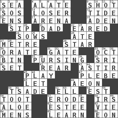 ACROSS 1. Ocean 4. Having winglike extensions 9. Opportunity 13. Mayday 14. Failure 15. Event that recurs at intervals 16. Followers of ems 17. Sports stadium 18. An important port of Yemen 19. Small drink 21. Male parent 22. Having ears or earlike features 24. Sty mamas 26. Had dinner 27. Distance measurement (Brit.) 29. Play the lead 30. Declaim 31. Yard entry 33. Sep. follower 36. Storage container 37. Puckering 40. _ Lanka 41. Arrange properly for use 42. Rump 43. Being in motion 45. Frolic 47. First-year military academy student 48. Allow 49. Period of immesurable duration 50. Sadhe (variant) 52. Pipe bend 54. Eastern Standard Time (abbr.) 56. A blast of a horn 57. Wear away 59. Big collection agency 61. Medicinal plant 62. First name in cosmetics 63. Compete 64. Not women's 65. Acquire or gain knowledge or skills 66. A really long time DOWN 1. Compass dir. 2. Immeasurably long periods of time 3. Aide 4. Wing 5. Titled peers of a realm 6. Toward the sea 7. Watch over 8. Epoch 9. A viewer who gazes fixedly 10. Flintstone garb 11. Wrote a lyric poem 12. Nine, plus one 20. Left side of a ship or aircraft 22. Consumed 23. "One Day ___ Time" 25. Shed a tear 27. Crowds into 28. One of the Great Lakes 29. Agitate 31. Jennifer or Joel 32. White ___ sheet 33. Clearly or manifestly demonstrative 34. Baby bed with high sides 35. Become fatigued 38. A salt of uric acid 39. Yawn 44. _ gin 45. Food holders 46. Directed 49. Tree or shrub in the Birch family 50. Lacquered or enameled metalware 51. Within a short period 52. Celtic language 53. Globular water bottle used in Asia 55. Musical group of three 56. Scottish cap 57. Snakelike fish 58. Car or cant ending 60. Elected rep.