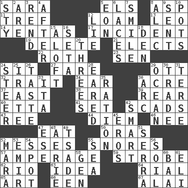 ACROSS 1. "Two Mules for Sister ____" 5. Raised railways 8. Cleo's killer 11. Not kosher 12. Rich soil 13. Lion 14. Gossips 17. Event 19. Keyboard key 21. Chooses 22. Writer of Portnoy's Complaint (1969) 23. Elected rep. 24. Be seated 27. Conductor's collection 29. Baseball player Mel 32. Distinguishing feature 34. Hearing organ 36. 43,560 square feet 37. 90 degrees 38. Period 39. Buttocks 40. Singer James 41. Put into a specified state 42. Heaps 43. Portuguese money of account (variant) 44. South Vietnam president (1954) 46. Born 47. Consume 50. Mouths or openings 52. Makes clutter 55. Sounds asleep 57. Electrical Measurement 59. Disco prop 62. _ de Janeiro 63. It may be bright or harebrained 64. Monetary unit of Yemen 65. Nonscientific branch of learning 66. Car or cant ending 67. Jai ____ DOWN 1. Filthy place 2. "We ___ not amused" (Victoria) 3. Tear apart 4. Following 5. Age 6. Shoestrings 7. Grin 8. Actor Baldwin 9. Transmitted 10. Cooking vessels 12. Whopper 15. Upward 16. Stalk of a moss capsule 18. Lair 20. Trios 24. Navigate 25. Feeling or showing extreme anger 26. Clothes sense 28. Having ears or earlike features 29. Sea 30. Exchange 31. Laconic 33. Call ___ day 35. Food allowance for one day 36. Curve 42. Don Adams' spy role 45. Greek god of love 47. Compass dir. 48. Nest on high 49. Sadhe (variant) 51. Father Junipero _ 52. Hindu Mythology: god of death 53. Independent ruler or chieftain 54. Blemish 55. Ocean 56. The visible part of the earth's surface 58. Commissioned mil. rank 60. Sound made by sheep 61. Biblical high priest