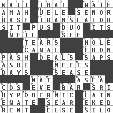 ACROSS 1. Electrical Unit 5. Not this but _ 9. Nathan's nickname 13. Housemaid 14. Ubangi River tributary 15. Sir (Sp.) 16. To erase 17. Interpreter 19. Be seated 20. Tenth month of the Hindu calendar 21. Superhero pair 22. It is 23. Famous astronaut Armstrong 25. Perceive with the eye 26. Lacerates 30. Undercover agent 34. Lessep's creation 35. Inky black, to poets 36. Romantic infatuation 39. Allots cards 42. Plant excrements 43. American tennis player Robert 44. Confronts 46. 24-hour periods 47. Gospel singer Marvin 48. Floor protector 51. At sea 54. Music discs 57. Night before a holiday 58. Soap unit 60. Indian title of respect (Mr.) 62. Under the skin 65. (Had) reclined 66. Maternal 67. Burn superficially 68. Made supply last 69. Monthly bill 70. Otherwise 71. Grain storage tower DOWN 1. Armed conflicts 2. With great haste 3. Clothes sense 4. Definite Article 5. Ballerina skirt 6. Possessive pronoun 7. Wing 8. Watches over 9. Teachers' org. 10. Against 11. A blast of a horn 12. Blunders 15. _ gin 18. Institute legal proceedings 20. Entreaty 24. Strong, restless desires 27. Also 28. Actress Charlotte 29. Criticizes harshly 30. Makes clutter 31. Chief or king in Benin or Nigeria 32. Chop off 33. Followers of ems 36. Groovy apt. 37. White ___ sheet 38. Like a shrinking violet 40. Area sheltered from the wind 41. Ocean 45. Russian ruler of old 48. Ancient Persian 49. "___ Maria" 50. Laconic 52. 1973 Nobel Price Winner (Physics) Leo 53. Satellite of Uranus 54. "Mermaids" star 55. Centimeter-gram-second unit of force 56. Connect, as a bridge 58. Prejudice 59. Measure of real estate 61. Southeast Asian peninsula 63. Baseball player Mel 64. Cartoonist voice _ Blanc 65. French article