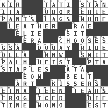 ACROSS 1. Apertif with cassis 4. Jacques of French films 8. Comedian Laurel of Laurel & Hardy 12. Call ___ day 13. Scent 14. One of the Great Lakes 15. Leg coverings 18. Fails to keep up a pace 19. Naked 20. Cordwainer's material 22. Actress Charlotte 23. Writer Wiesel 24. Be seated 25. Period 26. Elects 30. Girls' org. (abbr.) 33. A city in N France, SE of Calais 36. Travel on an animal 37. Spanish pot 39. Compass dir. 40. Stricken, poetically 41. Inside of hand 42. Robbery 44. Parent Teacher Association (abbr.) 45. Paper fasteners 47. "One Day ___ Time" 50. A really long time 51. Waist strap 53. Tate display 54. Smoochers 57. Inactive volcano in Sicily 59. Adolescent 61. Pulls apart 63. Toadlike animal 64. On the rocks 65. Pass on 66. Prong on a fork 67. Words to Nanette 68. Eastern Standard Time (abbr.) DOWN 1. Sleep 2. Slanted text style (abbr.) 3. Indian princess (variant) 4. Lacquered or enameled metalware 5. The sixth month of the Jewish calendar 6. Coat; cloak 7. Big collection agency 8. Legislators 9. Loyal 10. Assist 11. Born 16. Story 17. Agitate 21. Froth on beer 22. River (Sp.) 24. Like a shrinking violet 26. Crow sounds 27. Simple or foolish person 28. Prepare for publication 29. Stalk of a moss capsule 30. Republicans 31. Narrow board 32. Silent film actress Nazimova 34. Singles 35. Corn or form start 38. Electrical Measurement 42. Layer 43. Bar bills 46. Car dealer's back yard 48. Trial 49. Toward shelter 52. Swap 53. Soon (poet.) 54. Peachy ____! 55. _ china 56. Indian titles of respect 57. Newt 58. Three (prefix) 59. Metal container 60. Environmental prefix 62. Put into a specified state