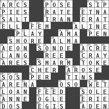 ACROSS 1. Arches 5. Introduce or present, as a question 9. Small drink 12. Sliced desserts 13. Pace 14. Inactive volcano in Sicily 15. Table seasoning 16. SW Asia republic 17. Part of Q.E.F. 18. Pipe bend 19. Opposite of masc. 21. Place in a line 22. Romp 24. Wet nurse (var.) 26. Writing instrument 27. Dinah or Pauly 28. _ mater 29. Age 30. Message 32. Land measure 36. Long (Scottish) 37. To riddle 38. Supercomputer manufacturer 39. Ancient Greek god of war 40. Excessive but superficial compliments 42. Puff or smoke 43. "Mermaids" star 44. Came up 46. Distress signal 49. For each 50. Canisters 51. Sports stadium 53. Bear (Spanish) 54. Dripping 57. Grant temporary use of 58. Nourish 61. Not divided or shared with others 62. Queen of England 1702-14 63. Stare at amorously 64. 4th largest of the Great Lakes 65. Two (Sp.) 66. Armor plate that protects the chest 67. An important port of Yemen DOWN 1. Domed church section 2. Monetary unit of Yemen 3. Portable communications device 4. Fast jet (abbr.) 5. Demure 6. Rowing implement 7. R.R. building 8. Car or cant ending 9. Long narrow piece of something 10. Lacking in sense or substance 11. Eucharist need 14. Snakelike fish 19. At a great distance 20. Sight organs 21. Auto club (abbr.) 23. Yearns 24. Tree or shrub in the Birch family 25. Madame (abbr.) 27. Wither 28. Approach 29. Chicken ___ king 31. Abalone 32. NE Massachussets city 33. What you're doing now 34. Immoral or dissolute person 35. Sight organ 40. A female animal or person 41. Floor protectors 43. Accounting whiz (abbr.) 45. _ de Janeiro 46. Vegetable dish 47. U. of Maine site 48. Actors Connery and Penn 52. Compass dir. 53. Lyric poems 55. Writer Wiesel 56. Adolescent 58. Enemy 59. Oval reproductive body of a fowl 60. Biblical high priest 61. Ocean