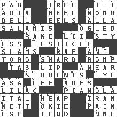 ACROSS 1. Groovy apt. 4. Woody plant 8. Teat (slang) 11. Operatic vocal solo 13. Person who is morally reprehensible 14. Words to Nanette 15. Small valley 16. Snakelike fish 17. Silent film actress Nazimova 18. Deli grouping 21. Stared 22. Libertine 23. Cards in a Roman deck? 25. Filthy place 26. Double-curved letter 29. One of the two male reproductive glands 32. Criticizes harshly 34. Actress Charlotte 35. Cuckoo 38. "Corrida" creature 39. Pottery fragment 41. Play 43. Keyboard key 44. Flaplike covering 45. Approach 46. SAT takers 50. Potassium hydroxide 51. White ___ sheet 54. Area sheltered from the wind 55. Ancient Greek god of war 57. Pale purple color 59. Player piano 63. Slanted text style (abbr.) 64. Pile 67. SW Asia republic 68. Remaining after all deductions 69. Migrant worker of the '30s 70. Ache 71. Compass dir. 72. Watch over 73. Compass dir. DOWN 1. Writing tablets 2. Type of rug 3. Deli pickle 4. College papers 5. To riddle 6. Snakelike fish 7. Raised railways 8. For Whom the Bell _____ 9. An arm off of a larger body of water 10. Sycophant 12. Having or resembling wings 14. Tired old horse 19. Floor coverings 20. Mamie's husband 21. Petroleum 23. One who doesn't tell the truth 24. On the rocks 26. Eastern Standard Time (abbr.) 27. Position in a hierarchy or organization 28. "Two Mules for Sister ____" 30. Exchange 31. Merit 33. Disorderly crowds 36. Christmas carol 37. "If ____ say so..." 39. Turn sharply 40. Flintstone garb 42. Before (prefix) 45. At sea 47. Affectionate concern, for short 48. Slept 49. Three (prefix) 51. Place in a line 52. Locates 53. Having winglike extensions 56. Sever or remove by pinching or nipping 58. Keyboard modifier key 60. NW Algerian seaport 61. (Had) reclined 62. Singer Murray 64. Being at a high temperature 65. Supplement with great effort 66. The 18th letter of the Arabic alphabet