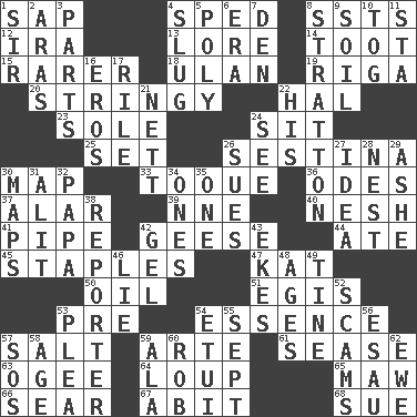 ACROSS 1. Plant excrement 4. Hurried 8. Fast planes 12. Retirement account (abbr.) 13. Old wives' tales, e.g. 14. A blast of a horn 15. Less widely known 18. ____ Bator, Mongolia 19. Capital of Latvia 20. Slender, wiry 22. Actor Linden 23. Not divided or shared with others 24. Be seated 25. Arrange properly for use 26. French poetic form 30. Atlas unit 33. Woman's close-fitting hat 36. Lyric poems 37. Having or resembling wings 39. Compass dir. 40. Delicate 41. Corncob 42. Honkers 44. Had dinner 45. Paper fasteners 47. Krazy ___ of comics 50. Lubricate 51. The front part of a cuirass 53. Before (prefix) 54. Core 57. Table seasoning 59. Johnson of "Laugh-In" 61. Gospel singer Marvin 63. Double curve, resembling the letter S 64. Central Nebraska county 65. Opening into something insatiable 66. Dry up 67. "This won't hurt ____!" 68. Institute legal proceedings DOWN 1. Title for a knight 2. Ancient river in northeast Turkey 3. Components 4. Snaillike creature with no shell 5. More than one (prefix) 6. Period 7. Lair 8. Ski resort town in Vermont 9. Earth 10. Coat; cloak 11. R.R. building 16. Greek god of love 17. Cause heat under the collar 21. Remaining after all deductions 22. Part of HMS, perhaps 24. Perceive with the eye 26. Institutes legal proceedings 27. The content of cognition 28. A home for chicks 29. American tennis player Robert 30. Atlas contents 31. Came down and settled, as after flight 32. Dad 34. Singles 35. Single 38. News announcer 42. Set 43. Supplements with great effort 46. Falsehood 48. Eras 49. Prong on a fork 52. Fraudulent business schemes 53. Entreaty 54. Needle holder 55. Back-to-school mo. 56. He sold his birthright 57. Distress signal 58. Grow older 59. Chicken ___ king 60. Director Reiner 62. She-sheep