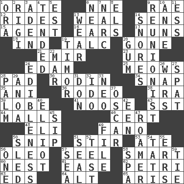 ACROSS 1. Declaim 6. Compass dir. 9. Actress Charlotte 12. Amusement-park features 13. Welt 14. Elected reps. 15. Representative 16. Hearing organs 17. Religious women 18. Working for oneself (abbr.) 19. Baby powder 20. Went 21. Independent ruler or chieftain 23. RI univ. 24. Dutch treat 25. Catcalls? 28. Groovy apt. 30. "The Thinker" sculptor 34. Fastener 35. Black tropical American cuckoo 36. Cowboy competition 38. Lyricist Gershwin 39. Ear part 41. Trap for birds or small mammals 43. Fast jet (abbr.) 44. Promenades 46. Sure thing 48. Biblical high priest 49. Papal veil 50. Clip 51. Use a swizzle stick 53. Had dinner 56. Margarine 57. Stitch closed the eyes of (a falcon) 58. Don Adams' spy role 60. A home for chicks 61. Relaxation 62. _ dish (used to culture cells) 63. Begley and Asner 64. The first octave above the treble staff 65. Ascend DOWN 1. Mouth or opening 2. Swiss mountan, "Queen of the Mountains" 3. Arabian gulf 4. Looked after 5. Eastern Standard Time (abbr.) 6. Actress Patricia 7. Drug cop 8. Raised railways 9. One who advocates reunion 10. Singer Murray 11. Double-curved letter 13. Put on (as clothing) 14. Sounds asleep 19. The easternmost of the Lesser Sundas 20. Chewing product 22. Make imperfect 24. The property of being fit to eat 26. Armed conflicts 27. Petty quarrel 28. Inside of hand 29. Small Philippine buffalo 31. Spanish title 32. Wedding promise 33. Modern: prefix 37. Witty Wilde 40. American author Paul (1891-1958) 42. Car or cant ending 45. Small drink 47. Wanderer 49. Do some clerical work 50. Downhill vehicle 51. Lick closed 52. Trial 54. Jacques of French films 55. Blunders 56. Single 57. Ocean 58. Health resort 59. Make a knot