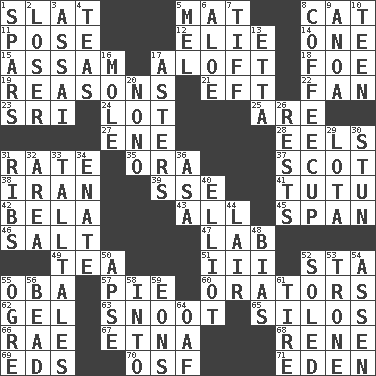 ACROSS 1. Narrow board 5. Floor covering 8. Domesticated feline 11. Introduce or present, as a question 12. Writer Wiesel 14. Single 15. Indian state 17. Upward 18. Enemy 19. Thinks logically 21. Bank Draft (abbr.) 22. Avid follower 23. Indian title of respect (Mr.) 24. Car dealer's back yard 25. "We ___ not amused" (Victoria) 27. Compass dir. 28. Snakelike fish 31. Assign a rank or rating to 35. Mouth or opening 37. Highlander 38. SW Asia republic 39. Compass dir. 41. Ballerina skirt 42. Actor Lugosi 43. Everything 45. Connect, as a bridge 46. Table seasoning 47. Experiment locale 49. Afternoon social gathering 51. One more than two 52. R.R. building 55. Chief or king in Benin or Nigeria 57. Sliced dessert 60. Speakers 62. Set 63. Snob 65. Grain storage towers 66. Actress Charlotte 67. Inactive volcano in Sicily 68. French philosopher Descartes 69. Begley and Asner 70. Order of Saint Francis (abbr.) 71. Locale of original sin DOWN 1. Practice fights 2. Failure 3. Slender Brazilian palm 4. Afternoon social gatherings 5. Cartoonist voice _ Blanc 6. Medicinal plant 7. Small quarrel 8. Java holder (2 wds.) 9. Small Philippine buffalo 10. Adolescent 13. Singer James 16. Undercover agent 17. Michaelmas daisies 20. Words to Nanette 26. Musical pauses 29. Globular water bottle used in Asia 30. Surprise greatly 31. Teases 32. Length times width 33. Baron Munchausen's specialties 34. Related on the mother's side 36. White ___ sheet 40. American author Paul (1891-1958) 44. Den 48. Prejudice 50. Domed church section 52. Having a sole or soles 53. Marketplace scale 54. NE Netherlands city 55. Legendary monster 56. Necklace unit 58. To the inside or interior of 59. Immeasurably long periods of time 61. Become fatigued 64. Clumsy lout