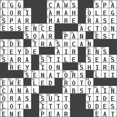 ACROSS 1. Oval reproductive body of a fowl 4. Crow sounds 8. Health resort 11. Australian parrot (variant) 13. Wet nurse 14. Cassini of fashion 15. Practice fight 16. Female horse 17. To erase 18. Gist 21. 13-14th century defensive garment 22. Fly high 23. Baking dish 25. Eastern Standard Time (abbr.) 26. Binary compound 29. File 13 32. Miss Universe 1986, Barbara Palacios _ 34. Wind 35. Followers of ems 38. "Two Mules for Sister ____" 39. Vertical member of a panel or frame 41. Oceans 43. Marina Del _, California 44. Electrically charged atom 45. Bake eggs in their shells 46. Legislators 50. Cards in a Roman deck? 51. She-sheep 54. Directed 55. Printing process, for short 57. Lessep's creation 59. Refrain by choice 63. Mouths or openings 64. Set or collection 67. Periodic rise and fall of the sea level 68. Globular water bottle used in Asia 69. "Tell ____ the Marines!" 70. Lyric poems 71. Compass dir. 72. Lightbulb-shaped fruit 73. Consume DOWN 1. Otherwise 2. Republicans 3. Pate de foie ____ 4. Device for capturing images 5. Nanny (var.) 6. Armed conflict 7. A female animal or person 8. Chalkboard 9. Mexican monetary units 10. Rep 12. Angers 14. The grampus (Milton) 19. Brief written record 20. Automobile 21. Santa ___, CA 23. Silvers or Donahue 24. 43,560 square feet 26. ___ a Wonderful Life 27. Letter starter 28. Jane of fiction 30. Inhabitant of Heaven 31. Tender 33. 24-hour periods 36. Famous astronaut Armstrong 37. Indian skirt 39. Trig term 40. Frog relative 42. _ Lanka 45. Fast planes 47. Pipe bend 48. Speaker 49. Director Reiner 51. Learning spot: Fr. 52. Make _____ (do battle with) 53. Related on the mother's side 56. Von Bismarck 58. White ___ sheet 60. Assistant 61. The main thing one is thinking about 62. A home for chicks 64. Small drink 65. Shoshoni 66. Call ___ day