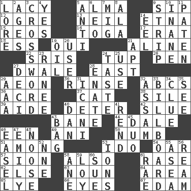 ACROSS 1. Made of lace 5. _ mater 9. Small drink 12. Legendary monster 13. Famous astronaut Armstrong 14. Inactive volcano in Sicily 15. Vintage cars 16. Ancient Roman robe 17. Part of Q.E.F. 18. Double-curved letter 19. Fr. "Yes" 21. Place in a line 22. Indian titles of respect 24. Uncastrated adult male sheep 26. Writing instrument 27. A sleeping potion; an opiate (poet.) 28. Compass direction 29. Age 30. Wash lightly 32. Lettered men learn these first 36. Land measure 37. Feline 38. Filth; sediment 39. Assistant 40. Prevent from occurring 42. Change direction abruptly 43. Object of repulsion 44. Peak District village in England 46. Car or cant ending 49. Black tropical American cuckoo 50. Unfeeling 51. Amid 53. Wedding promise 54. Boat paddle 57. The Jewish people; Israel 58. In addition 61. Raze (variant) 62. Otherwise 63. Part of speech 64. Length times width 65. Potassium hydroxide 66. Snake ____ (dice throw) 67. Dutch treat DOWN 1. Old wives' tales, e.g. 2. Grows older 3. What you're doing now 4. Consenting reply 5. Against 6. Lion 7. Russian fighter aircraft 8. In the manner of 9. Empty completely 10. Empty; void 11. Eucharist need 14. Snakelike fish 19. Petroleum 20. One who makes use of a thing 21. Fitting 23. Indian princess (variant) 24. Clothes sense 25. Purpose 27. Tenth: prefix 28. Related on the mother's side 29. Auto club (abbr.) 31. Ancient Celtic tribe of eastern Britain 32. Indian state 33. Big road sign 34. A slight indication 35. Perceive with the eye 40. Daniel's nick name 41. Tear apart 43. Container for groceries 45. Superhero pair 46. Artist's stand 47. Poet Dickinson 48. Trap for birds or small mammals 52. Compass dir. 53. Charged atoms 55. At sea 56. 480, 500 or 516 sheets of paper 58. A saturated hydrocarbon 59. Myrna of the movies 60. Take to court 61. Actress Charlotte