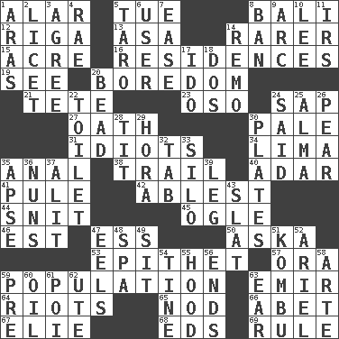 ACROSS 1. Having or resembling wings 5. Third day of the wk. 8. Indonesian resort city 12. Port city in Latvia 13. White ___ sheet 14. More uncommon 15. Land measure 16. Dwellings 19. Perceive with the eye 20. Mood resulting from idleness 21. Wig 23. Bear (Spanish) 24. Plant excrement 27. Pledge 30. Light colored 31. Foolish or stupid persons 34. Pale green bean 35. Of or related to the anus 38. Drop behind 40. The sixth month of the Jewish calendar 41. Whimper 42. Most capable 44. In a ____ (agitated or irritated) 45. Stare 46. Eastern Standard Time (abbr.) 47. Curvy letter 50. "____ silly question..." 53. Curse 57. Mouth or opening 59. Census information 63. Arab leader 64. Disturbances 65. Allow head to fall sleepily 66. Collude with 67. Writer Wiesel 68. Begley and Asner 69. Court order DOWN 1. Ancient river in northeast Turkey 2. It is permitted: Lat. 3. Match 4. Actress Charlotte 5. Edible starchy tuberous root 6. One who makes use of a thing 7. Relaxation 8. Forbid 9. Curve 10. Area sheltered from the wind 11. Big collection agency 14. San ____ (Riviera town) 17. Wedding promise 18. Two (Sp.) 20. Necklace unit 22. Bathroom 24. Alleged 25. _ mater 26. Lightbulb-shaped fruit 28. Teat (slang) 29. Israeli folk dance 30. Food holders 32. Bar bill 33. Grain storage tower 35. Domed church section 36. Religious women 37. Came down and settled, as after flight 39. Part of a journey 43. Narrow board 47. Snakelike fish 48. Health resort 49. Be seated 51. Dried seaweed eaten as food 52. Satellite of Uranus 54. Prong on a fork 55. Parka part 56. Extremities 58. Johnson of "Laugh-In" 59. Before (prefix) 60. Petroleum 61. Luau course 62. Shoshoni 63. Hearing organ