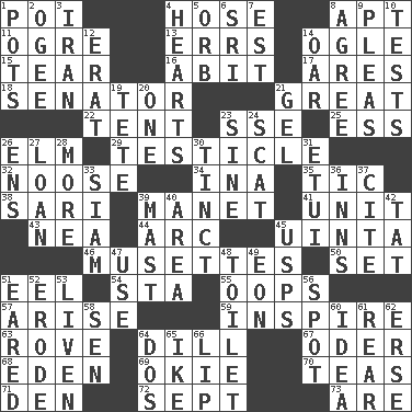ACROSS 1. Luau course 4. Stockings 8. Fitting 11. Legendary monster 13. Blunders 14. Stare 15. Rend 16. "This won't hurt ____!" 17. Ancient Greek god of war 18. Legislator 21. Relatively large 22. Portable shelter 23. Compass dir. 25. Curvy letter 26. Shade tree 29. One of the two male reproductive glands 32. Trap for birds or small mammals 34. _ tizzy (2 wds.) 35. Nervous spasm 38. Indian skirt 39. French painter Edouard 41. A single undivided whole 43. Teachers' org. 44. Curve 45. National forest in Provo, Utah 46. French bagpipes 50. Arrange properly for use 51. Snakelike fish 54. R.R. building 55. I made a mistake 57. Get up 59. Motivate 63. Be footloose 64. Deli pickle 67. River in Europe 68. Genesis locale 69. Migrant worker of the '30s 70. Afternoon social gatherings 71. Lair 72. Back-to-school mo. 73. "We ___ not amused" (Victoria) DOWN 1. Cooking vessels 2. Double curve, resembling the letter S 3. SW Asia republic 4. Centers of feelings and intuitions 5. Globe 6. _ Lanka 7. Eastern Standard Time (abbr.) 8. Match 9. Entreaties 10. Trials 12. Part of Q.E.F. 14. Boat paddle 19. False hair 20. Single 21. Set 23. Trig term 24. Get outta here! 26. Followers of ems 27. Grant temporary use of 28. Greater amount 30. Tinged 31. Needle case 33. Thailand, formerly 36. Lodging establishments 37. Quote 39. Vertical spar for supporting sails 40. Type of rug 42. Make lace 45. United States Postal Service (abbr.) 47. Purpose 48. Bathroom 49. Period of immesurable duration 51. Having ears or earlike features 52. Eat (away) 53. Make or become more lively 56. Specific locale 58. Elected rep. 60. The content of cognition 61. Tail end 62. Celtic language 64. Two (Sp.) 65. Mamie's mate 66. Mouth edge
