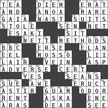 ACROSS 1. Beverage made from leaves 4. South Vietnam president (1954) 8. Part of Q.E.F. 12. Also 13. Small Philippine buffalo 14. Female horse 15. Greek goddess of the earth (variant) 17. Political cartoonist Thomas 18. Sets of matching outer garments 19. Took without asking 21. Elected rep. 23. Fish or hair follower 24. 1973 Nobel Price Winner (Physics) Leo 26. Be seated 28. Remaining after all deductions 30. Modes 34. English channel? 37. Celtic language 39. Style 40. Snakelike fish 41. With motion or animation 43. Cards in a Roman deck? 44. Den 46. Distinctive style or manner 47. Viper 48. Contrary to your interests or welfare 51. Sure thing 54. Consenting reply 55. Actors Connery and Penn 58. Take to court 61. Deep reverence 63. Spew [out] 65. Being in motion 67. Island territory of the United States 71. Scent 72. Monthly bill 73. "____ silly question..." 74. Compass dir. 75. Caspian sea tributary 76. Letter starter 77. Observe DOWN 1. Labels 2. Maternal 3. Goodbye (Sp.) 4. One of the 12 tribes of Israel 5. _ tizzy (2 wds.) 6. Greek goddess of the dawn 7. Floor coverings 8. Australian flightless bird 9. Water falling in drops from the sky 10. Johnson of "Laugh-In" 11. Trial 16. ____ Jay Lerner 18. In a ____ (agitated or irritated) 20. Supplement with great effort 22. Compass dir. 25. A whole individual unit 27. Definite Article 29. Collection of objects 30. Of or pertaining to a meson 31. Spanish pot 32. Raised platform 33. Clip 34. Actor Lugosi 35. Necklace unit 36. 154 in Roman numerals 38. Compass dir. 42. Singles 45. Marina Del _, California 49. Tail end 50. Compass dir. 52. Portuguese money of account (variant) 53. Pacific island yam 56. Unclothed pictures 57. Biscuitlike quick bread 58. "Two Mules for Sister ____" 59. One who uses or employs something 60. Inactive volcano in Sicily 62. Mild oath 64. Family _ (genealogy) 66. It is 68. Purpose 69. Alias (abbr.) 70. Spoil