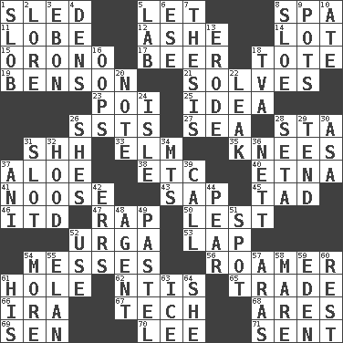 ACROSS 1. Downhill vehicle 5. Allow 8. Health resort 11. Ear part 12. American tennis player Robert 14. Car dealer's back yard 15. U. of Maine site 17. Fermented drink made from hops 18. Lug 19. Gillaume's butler role 21. Finds the solution 23. Luau course 25. The main thing one is thinking about 26. Fast planes 27. Ocean 28. R.R. building 31. Quiet! 33. Shade tree 35. Leg joints 37. _ vera 38. And so on (abbr.) 40. Inactive volcano in Sicily 41. Trap for birds or small mammals 43. Plant excrement 45. Bit 46. It would 47. Hit sharply and swiftly 50. For fear that 52. Capital and largest city of Mongolia 53. Pet locale 54. Makes clutter 56. Nomad 61. Hollow 62. Nuclear Threat Initiatives 65. Barter 66. Lyricist Gershwin 67. Georgia ____ (Atlanta school) 68. Ancient Greek god of war 69. Elected rep. 70. Area sheltered from the wind 71. Transmitted DOWN 1. Oscar Madison type 2. Old wives' tales, e.g. 3. Inky black, to poets 4. Lairs 5. Experiment locale 6. Compass dir. 7. College paper 8. A type of plum 9. Cooking vessels 10. Had dinner 13. Eat (away) 16. I made a mistake 18. Federal power corp. 20. Observe 22. Path through which fluid escapes 24. Capri or Wight 26. "______ My Girl" (Turtles hit) 28. Bristle 29. Look after 30. White ___ sheet 31. Narrow, elongated depression 32. Parka part 34. Mountains (abbr.) 36. Remaining after all deductions 37. Cuckoo 39. Give a ring to 42. Blunders 44. Lightbulb-shaped fruit 48. Rep 49. Soft color 51. Blemish 52. Purpose 54. Greater amount 55. Flair 57. Ancient river in northeast Turkey 58. Female horse 59. Locale of original sin 60. State of inaction 61. Part of HMS, perhaps 63. Frozen water 64. A female animal or person