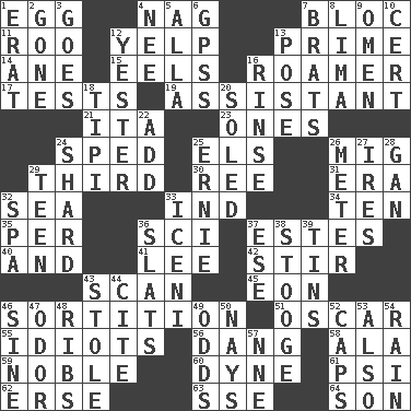 ACROSS 1. Ovum 4. Tired old horse 7. Group of countries in special alliance 11. Friend of Pooh 12. Sharp bark 13. First class 14. One (Scot) 15. Snakelike fish 16. Nomad 17. Trials 19. Aide 21. Call ___ day 23. Singles 24. Moved rapidly 25. Raised railways 26. Russian fighter aircraft 29. One of three equal parts 30. To sift 31. Period 32. Ocean 33. Working for oneself (abbr.) 34. Nine, plus one 35. For each 36. _-fi 37. _____ Park, CO 40. Plus 41. Area sheltered from the wind 42. Use a spoon 43. Examine hastily 45. Age 46. Making a chance decision by using lots 51. Motion picture award 55. Foolish or stupid persons 56. Mild oath, euphamism for damn 58. Chicken ___ king 59. Having high moral qualities 60. Unit of force 61. 23rd letter of the Greek alphabet 62. Celtic language 63. Compass dir. 64. Male offspring DOWN 1. Part of Q.E.F. 2. Went 3. Travels 4. Born 5. Silent film actress Nazimova 6. Global Positioning Systems (abbr.) 7. Naughty children 8. Pale green bean 9. Sign of things to come 10. Foregone conclusion 12. Next before 13. Airs 16. Wash lightly 18. Native american tent (variation) 20. Having a sole or soles 22. Say or write further 24. Broken piece 25. Bert's buddy 26. Distance measurement 27. Angers 28. Separate the seeds from cotton 29. Adolescent 32. Health resort 33. Ancient Celtic tribe of eastern Britain 36. Narrow boards 37. Compass dir. 38. Moe Howard, for one 39. Metal containers 43. Took without asking 44. Quote 46. Trig term 47. Scent 48. Teases 49. Likelihood 50. Negative votes 52. Balmoral and tarboosh 53. In addition 54. Precipitation 57. Compass dir.