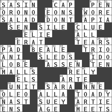 ACROSS 1. Indian antelope 6. Head covering 9. Writing instrument 12. U. of Maine site 13. Immeasurably long periods of time 14. Had on 15. First course 16. Do not 17. Capital of Western Samoa 18. Elected rep. 19. Filth; sediment 20. A slight indication 21. Writer Wiesel 23. 100% 24. Part of Q.E.F. 25. Rends 28. Groovy apt. 30. Calif. Air Force Base 34. Musical group of three 35. Black tropical American cuckoo 36. Bobsleighs 38. Wedding promise 39. Ear part 41. NE Netherlands city 43. "___ Little Indians" 44. Shopping centers 46. Have trust in 48. Raised railways 49. Johnson of "Laugh-In" 50. A single undivided whole 51. "Two Mules for Sister ____" 53. Compass dir. 56. Margarine 57. Silent film actress Nazimova 58. Sycophant 60. Political cartoonist Thomas 61. Chop _ 62. Nick name for Arthur 63. Followers of ems 64. Grow older 65. Confronts DOWN 1. Mayday 2. Ancient river in northeast Turkey 3. Flatfish 4. More lacking in sense or substance 5. Lower and raise head in agreement 6. Calm and collected 7. Singer Murray 8. Pacific Standard Time (abbr.) 9. Teen's desire 10. One of the Great Lakes 11. Teachers' org. 13. Singer Brickell 14. Place for singles 19. Locates 20. Domesticated feline 22. Experiment locale 24. The property of being fit to eat 26. Travel on or in a vehicle 27. Within a short period 28. Inside of hand 29. Small Philippine buffalo 31. In the manner of 32. French article 33. Begley and Asner 37. Spanish missionary in California 40. American author Paul (1891-1958) 42. Fish or hair follower 45. Fast jet (abbr.) 47. Poe poem 49. Like ___ of sunshine 50. Uhlan (variant) 51. Strike heavily 52. Toward shelter 54. Nathan's nickname 55. Prepare for publication 56. Single 57. White ___ sheet 58. Scottish cap 59. It is so